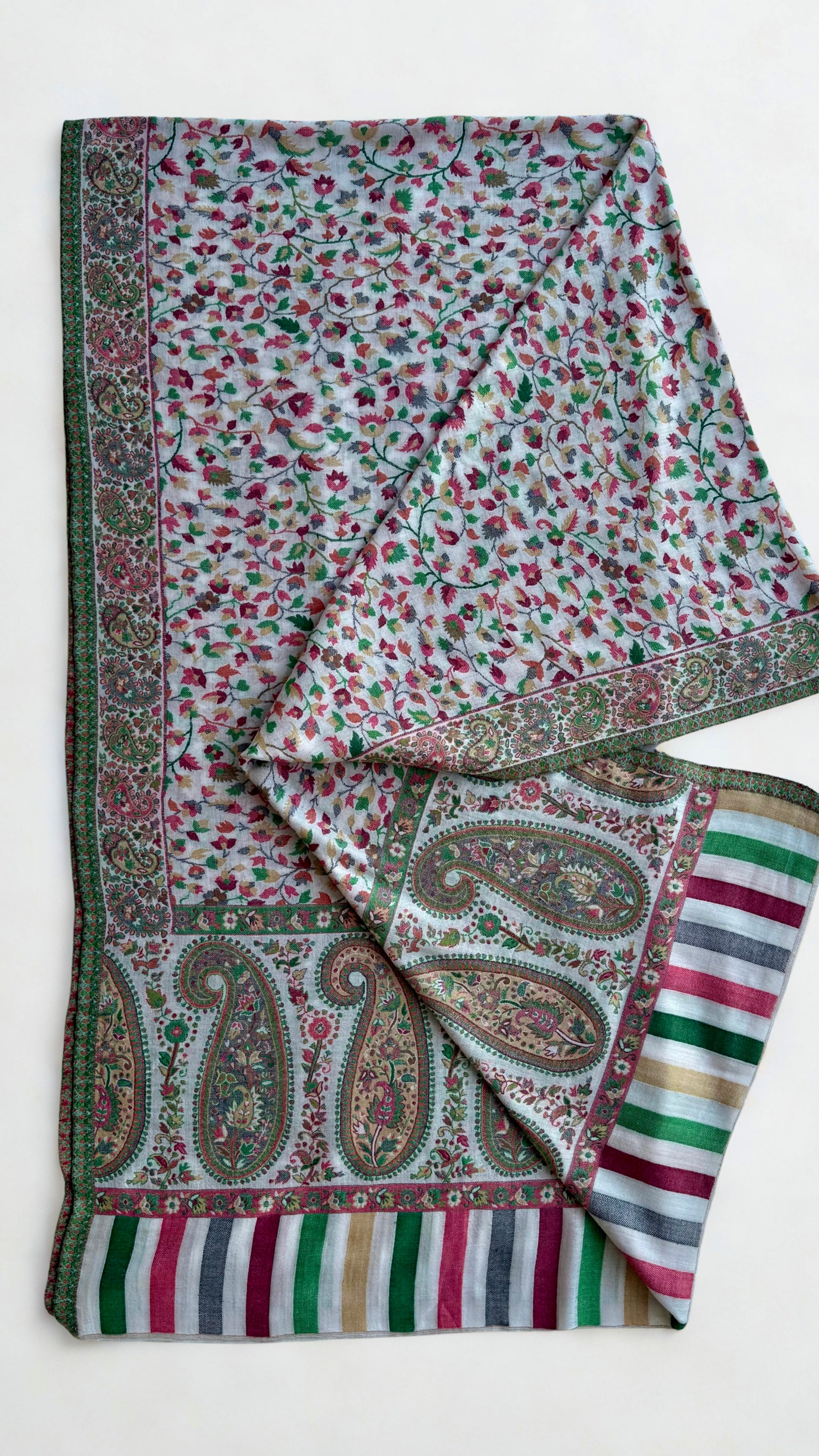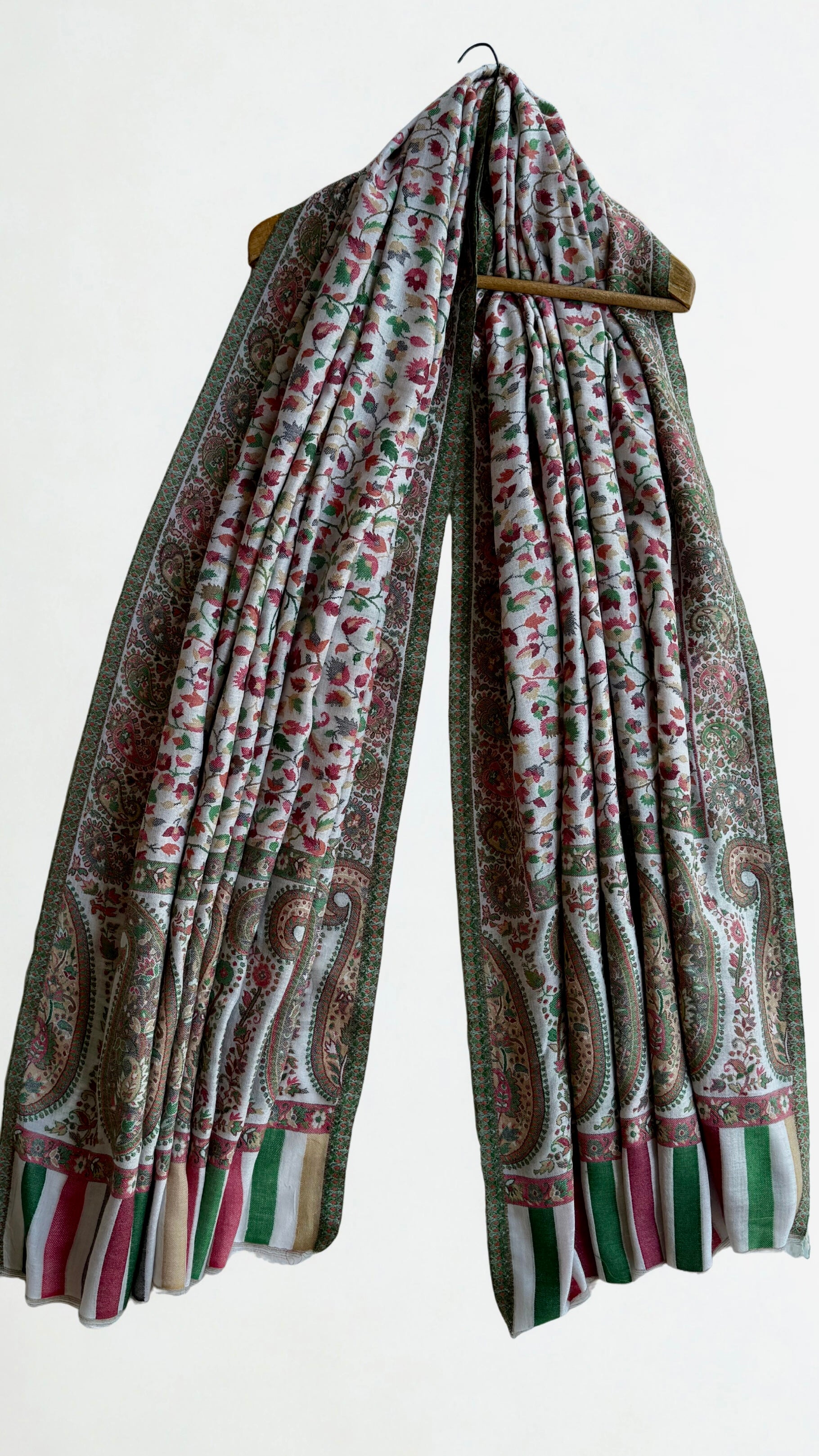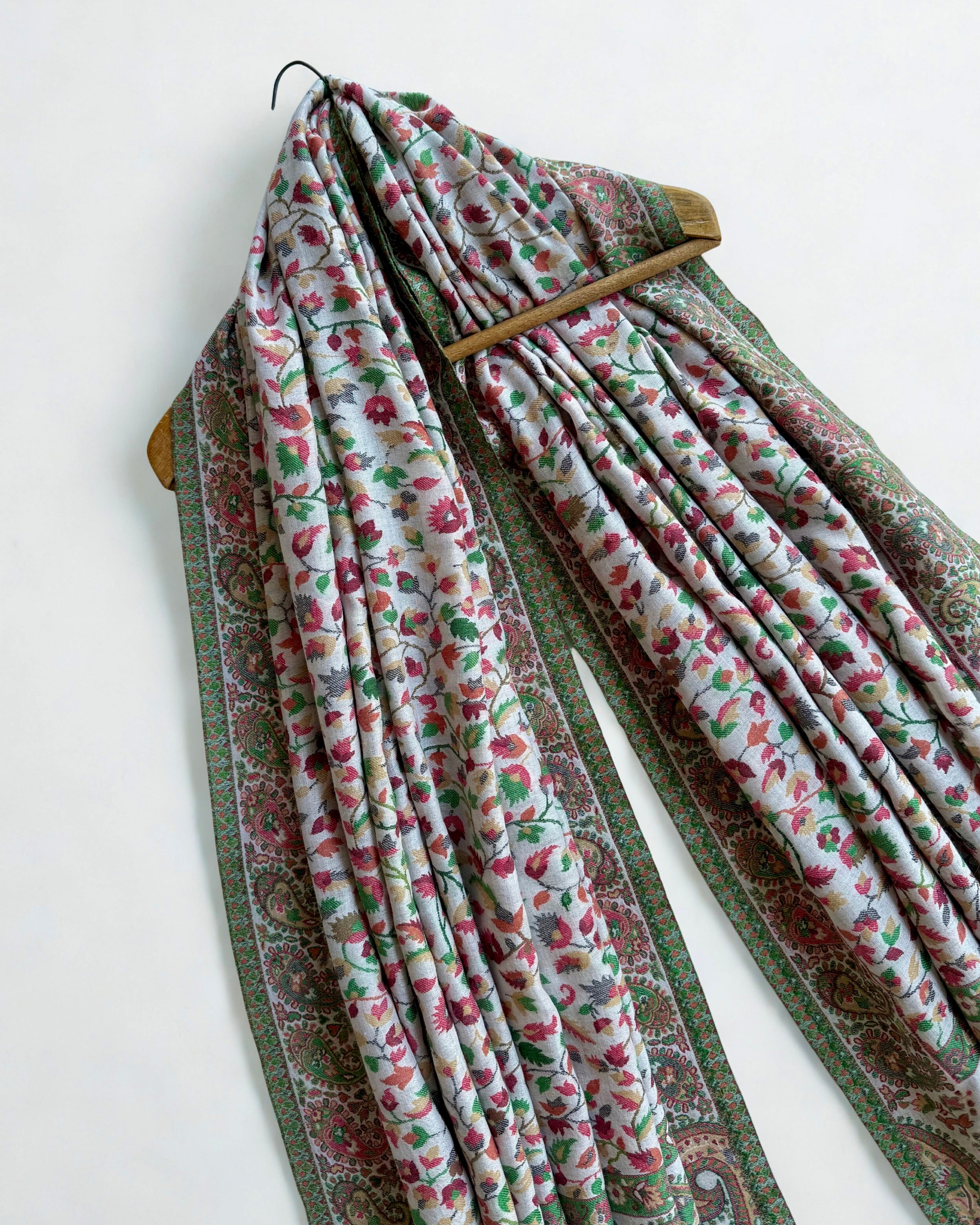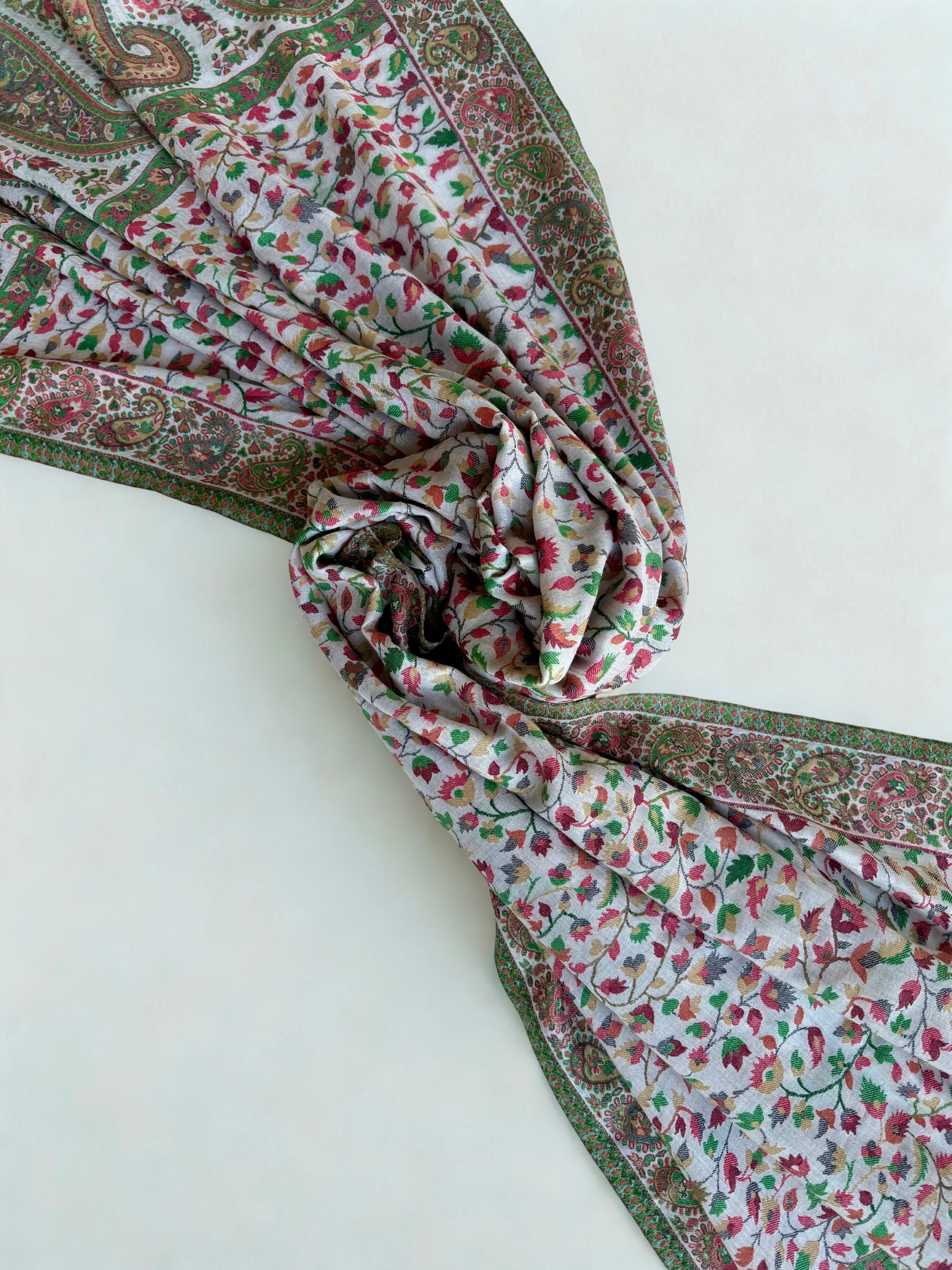 Experience the pinnacle of Indian textile craftsmanship with this exquisite double Shahtoosh Kani shawl. Hand-woven from pure Shahtoosh wool, this white masterpiece combines unparalleled softness with remarkable warmth despite its feather-light construction. Intricate Kani embroidery adorns the fabric, showcasing traditional artistry passed down through generations. Perfect for those who appreciate timeless elegance, this luxury shawl transcends seasonal trends, offering both sophistication and comfort. Its ultra-lightweight nature makes it ideal for layering without bulk, while the premium material ensures lasting durability. A true class-apart accessory that elevates any wardrobe with understated luxury and refined grace.