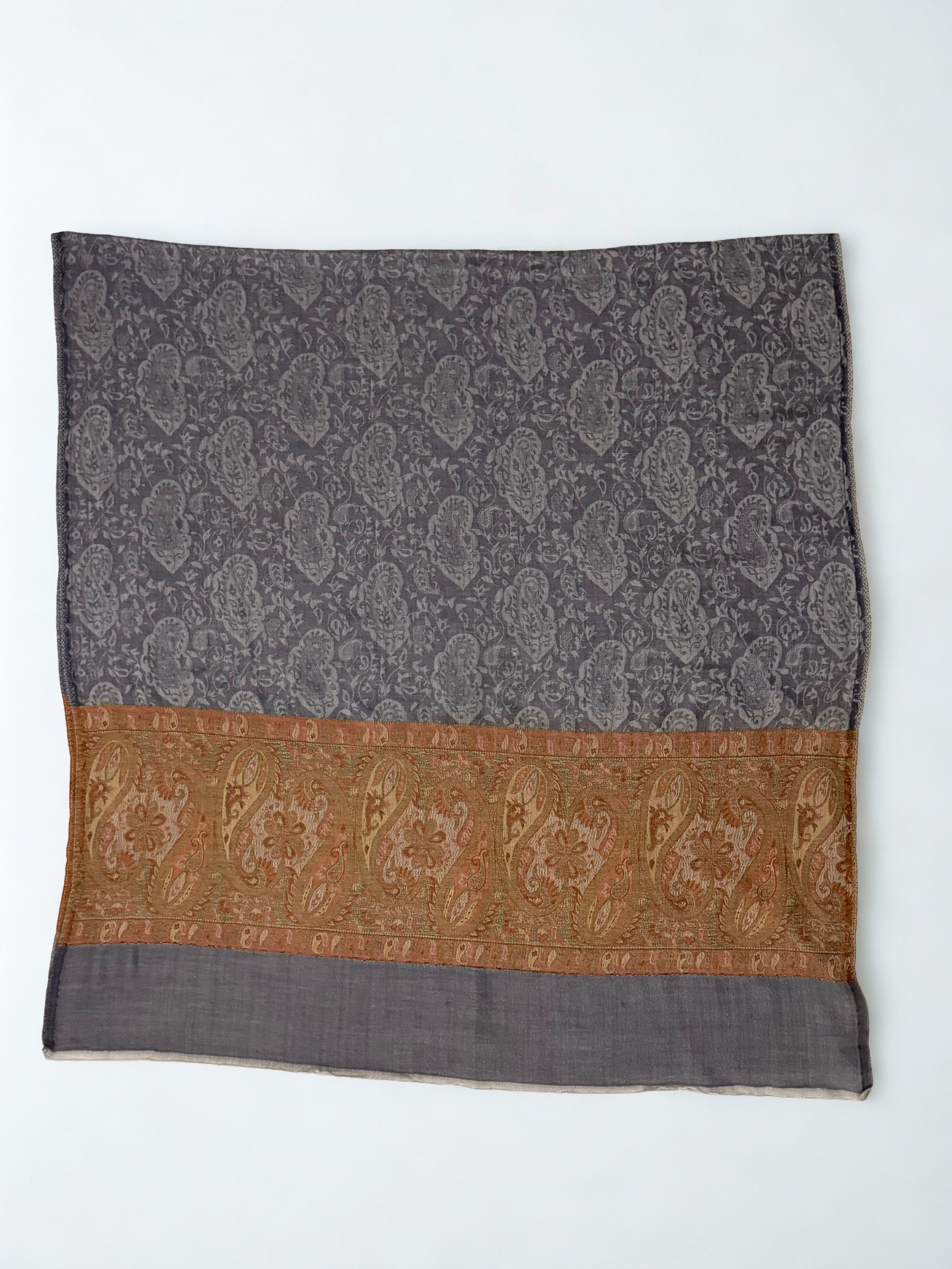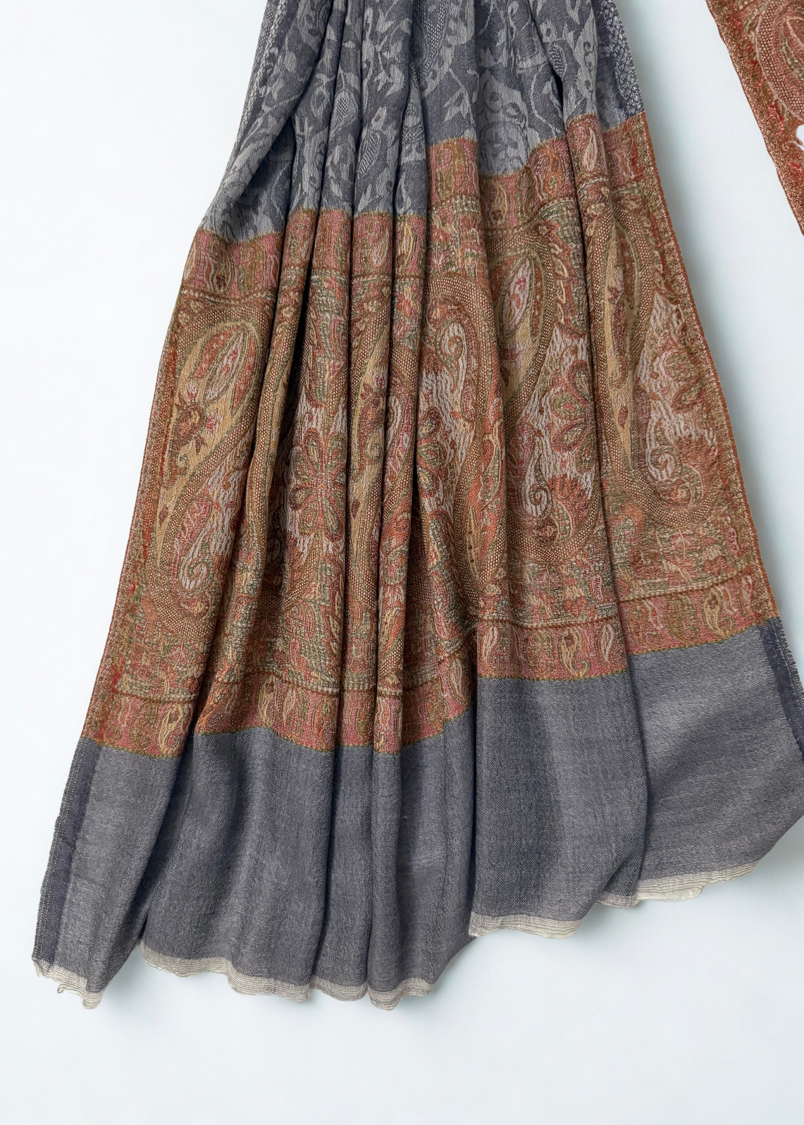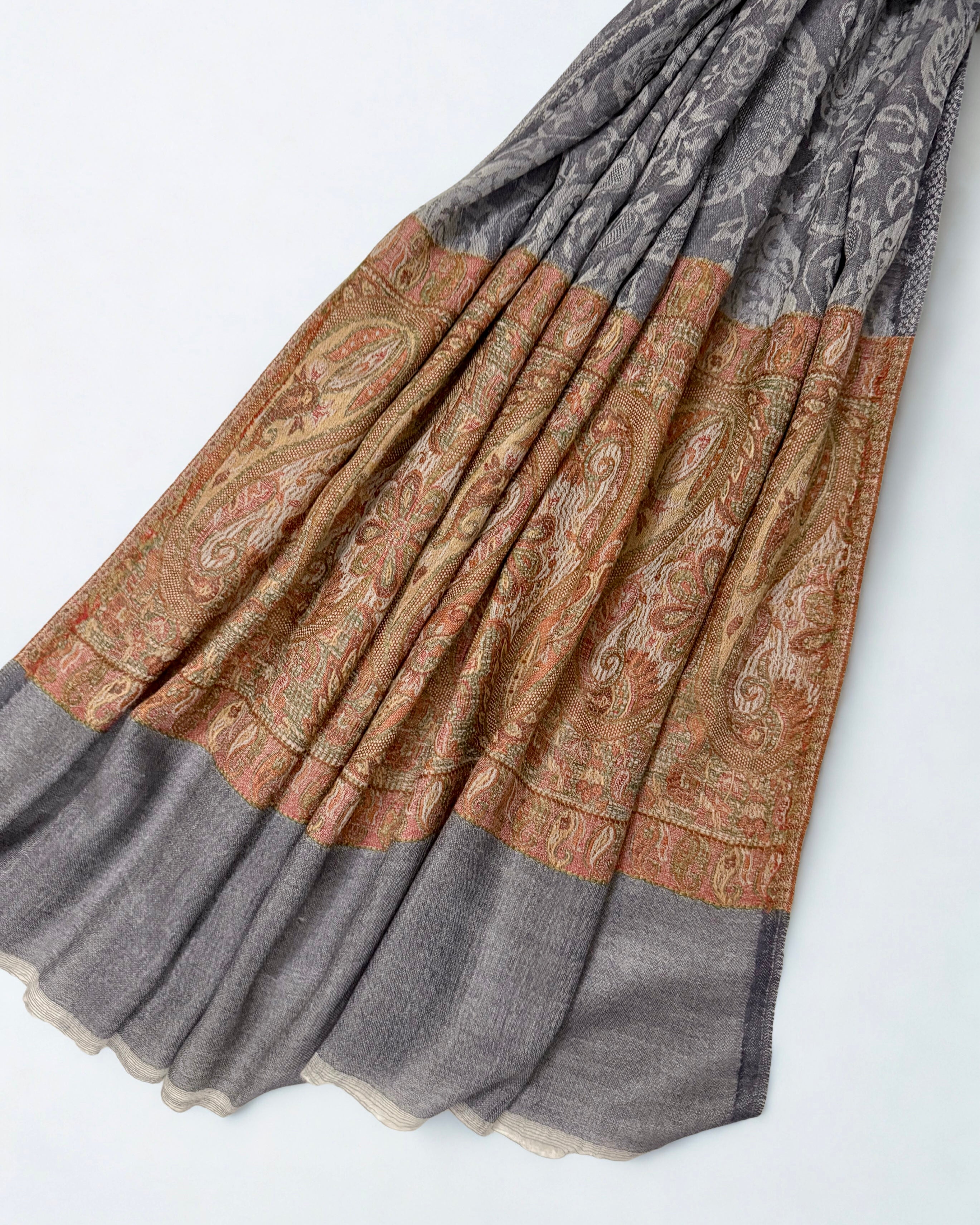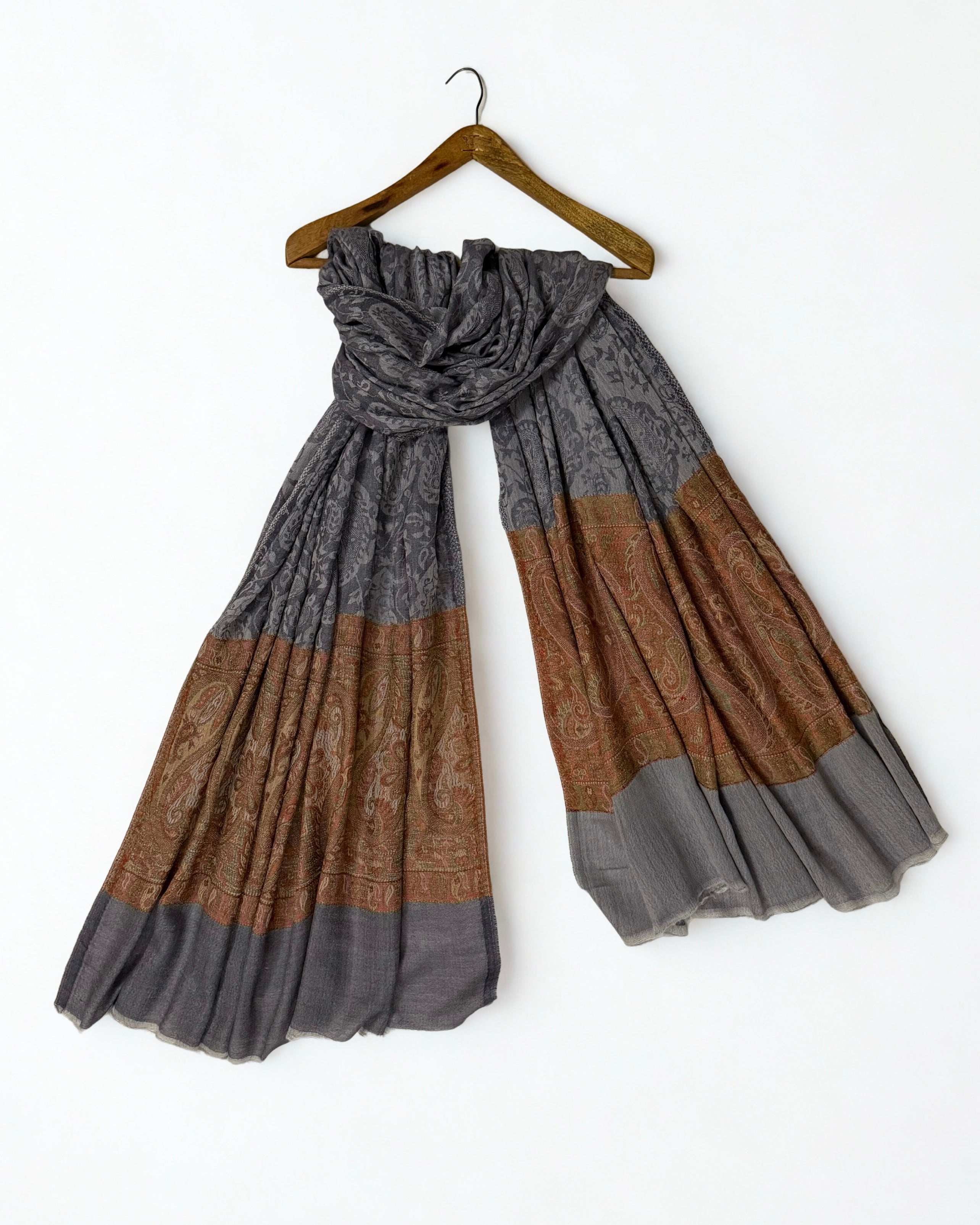 Experience unparalleled luxury with this handwoven Indian shahtoosh shawl in sophisticated charcoal grey. Crafted with extraordinary fineness, it passes through a ring with remarkable ease—a testament to masterful artisanal skill. Featuring...