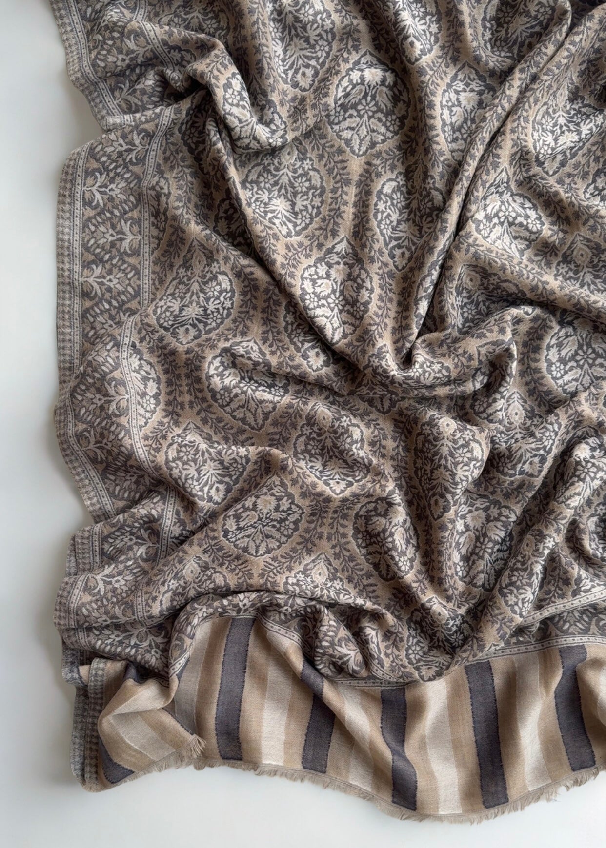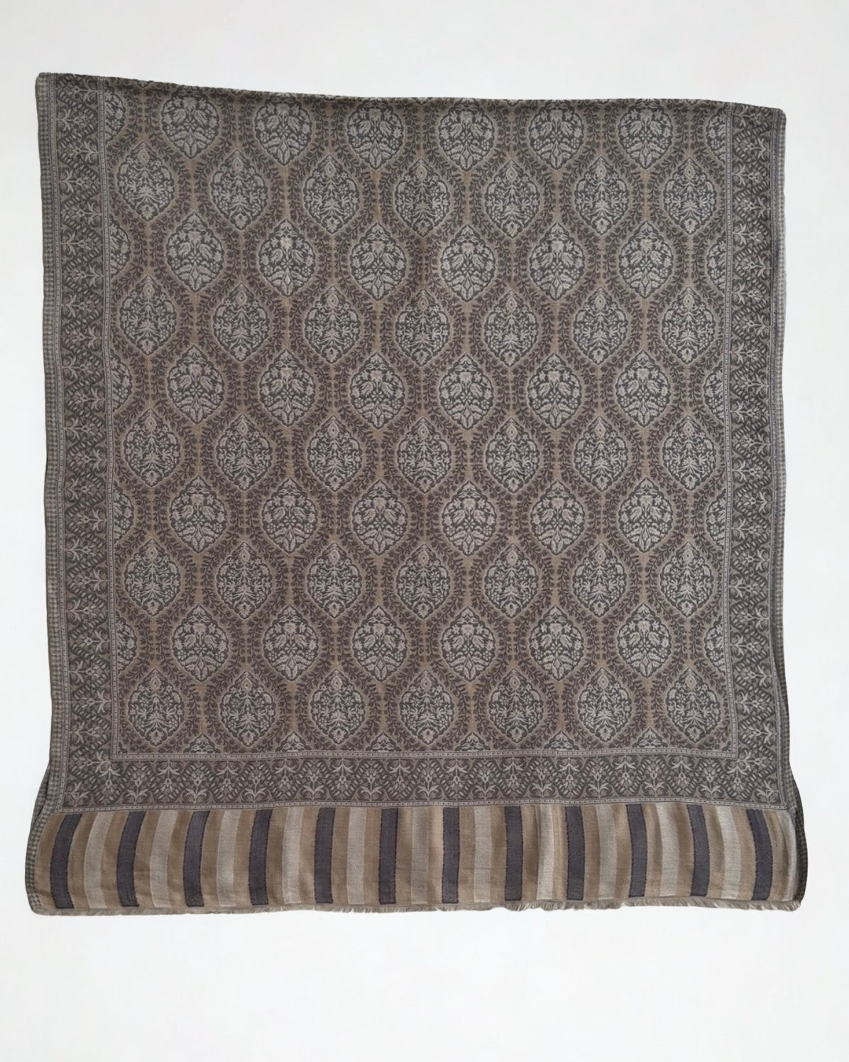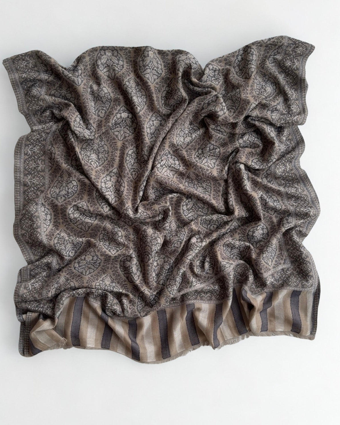 Experience the unparalleled luxury of authentic Indian shahtoosh with this exquisite handwoven shawl in dusty walnut. Crafted from pure shahtoosh that passes the ring test, this timeless piece combines feather-light softness with exceptional warmth. Its classic elegance transcends seasons and trends, making it a versatile addition to any wardrobe. Whether draped as a palladar or worn as a statement accessory, this sophisticated shawl embodies refined style and enduring beauty—a testament to centuries of weaving mastery.