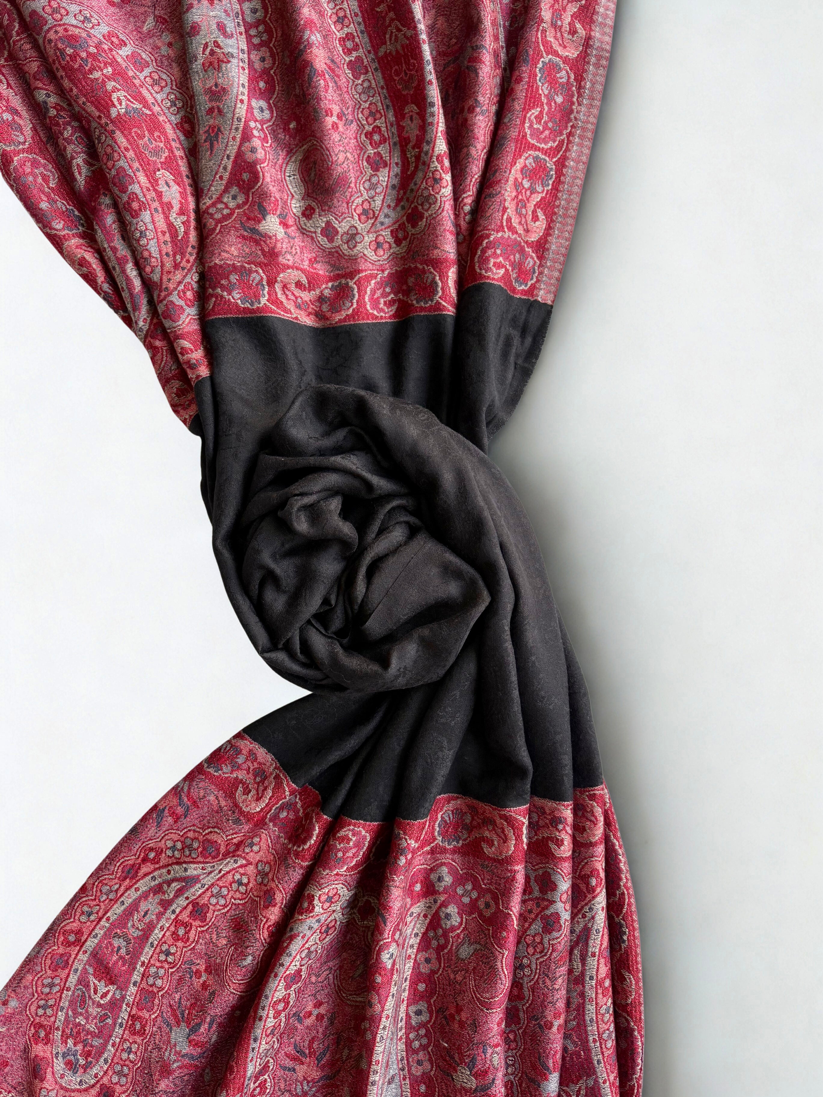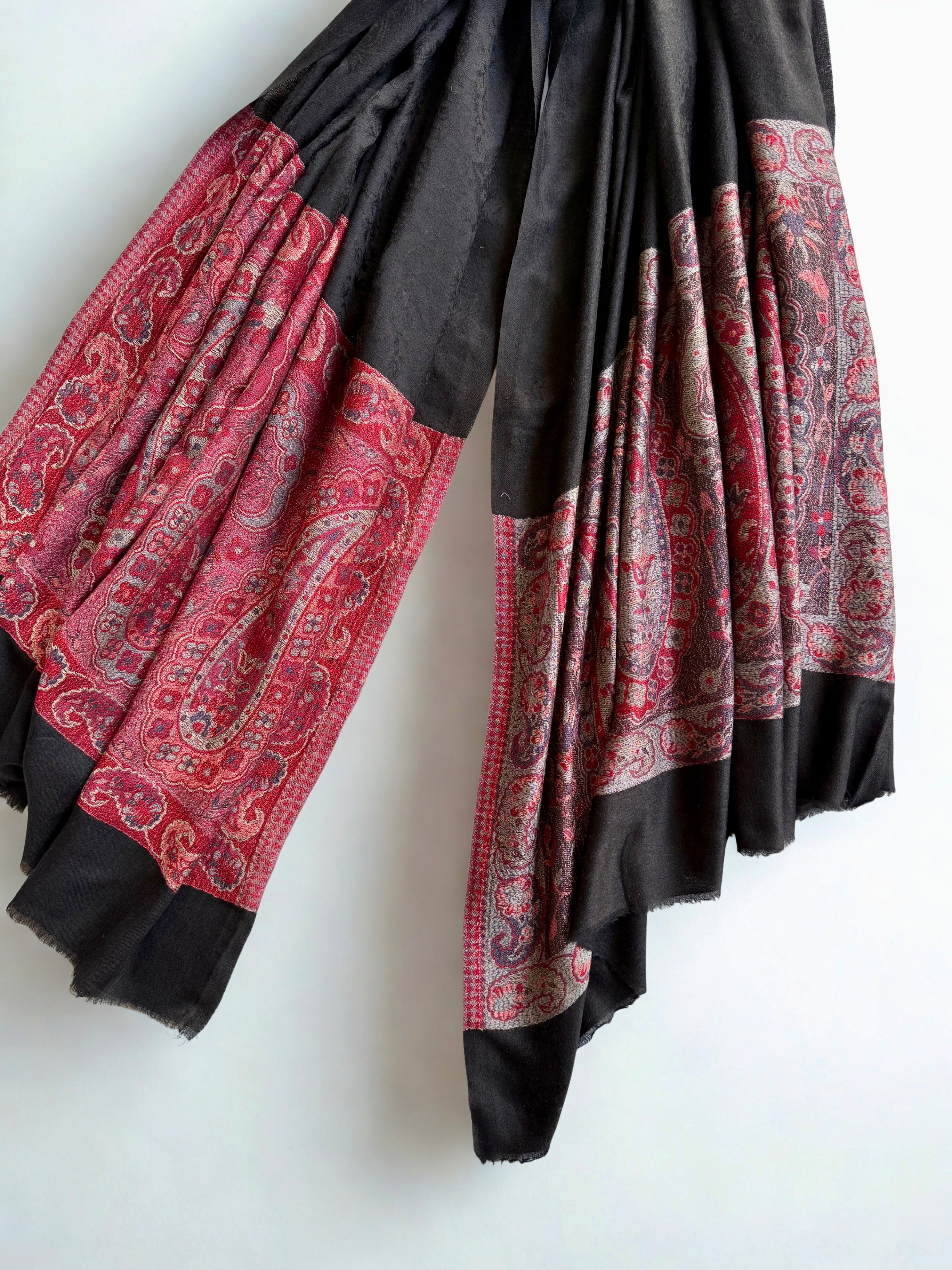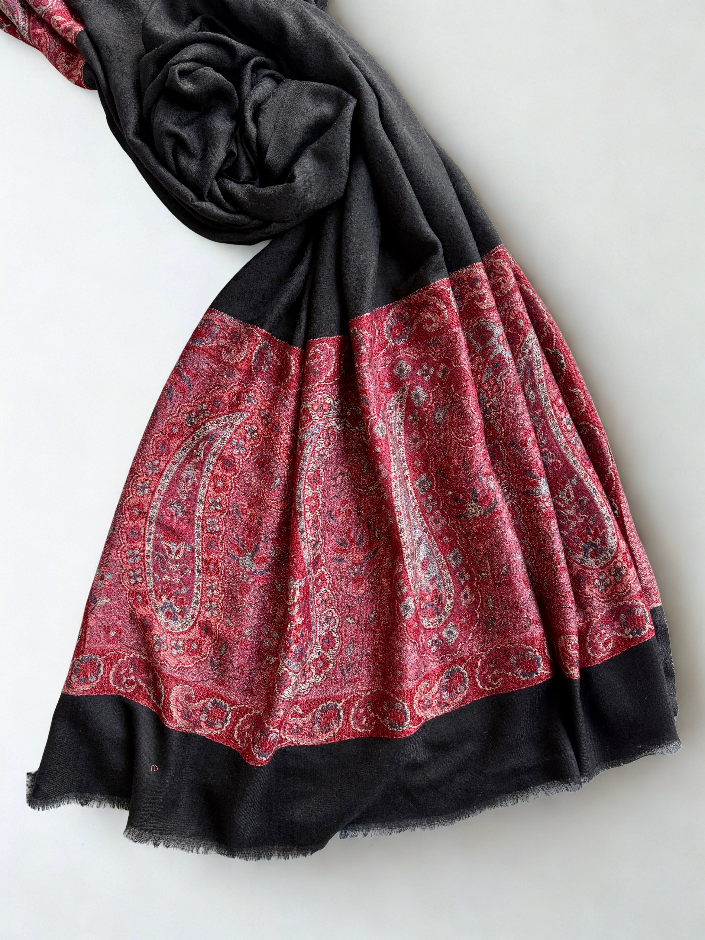 Discover the epitome of luxury with this exquisite Indian shahtoosh ring shawl, a masterpiece of traditional craftsmanship. Woven in sumptuous black with a striking red palla adorned with intricate embroidery, this exceptionally fine shawl glides effortlessly through its accompanying ring—a hallmark of authentic shahtoosh quality. Renowned for its silk-like smoothness and remarkable rarity, this timeless piece combines warmth with feather-light comfort. Durable and exclusive, it transcends seasonal trends, serving as an investment in enduring elegance. Perfect for those who appreciate the finest textiles and appreciate heritage artistry.