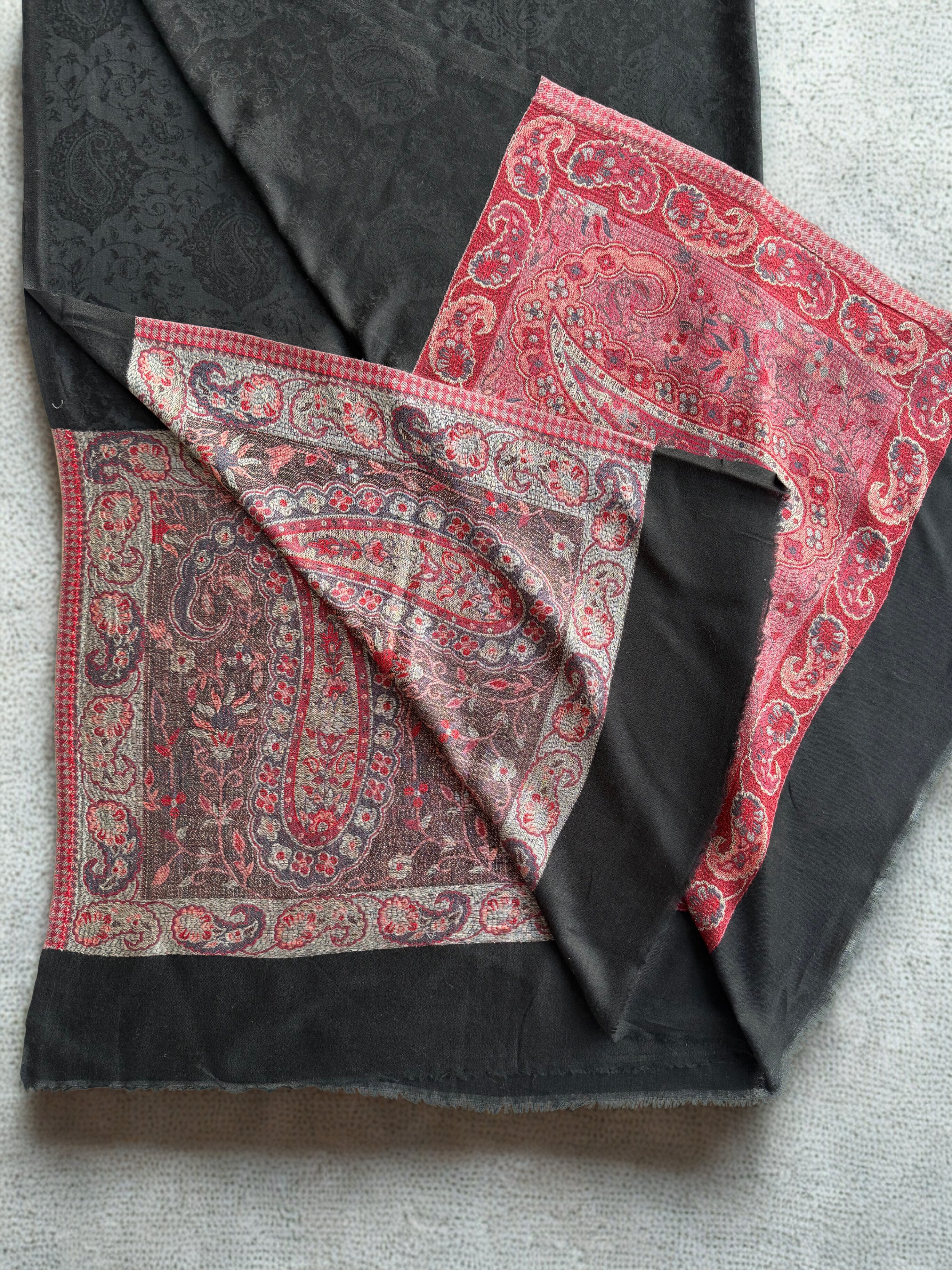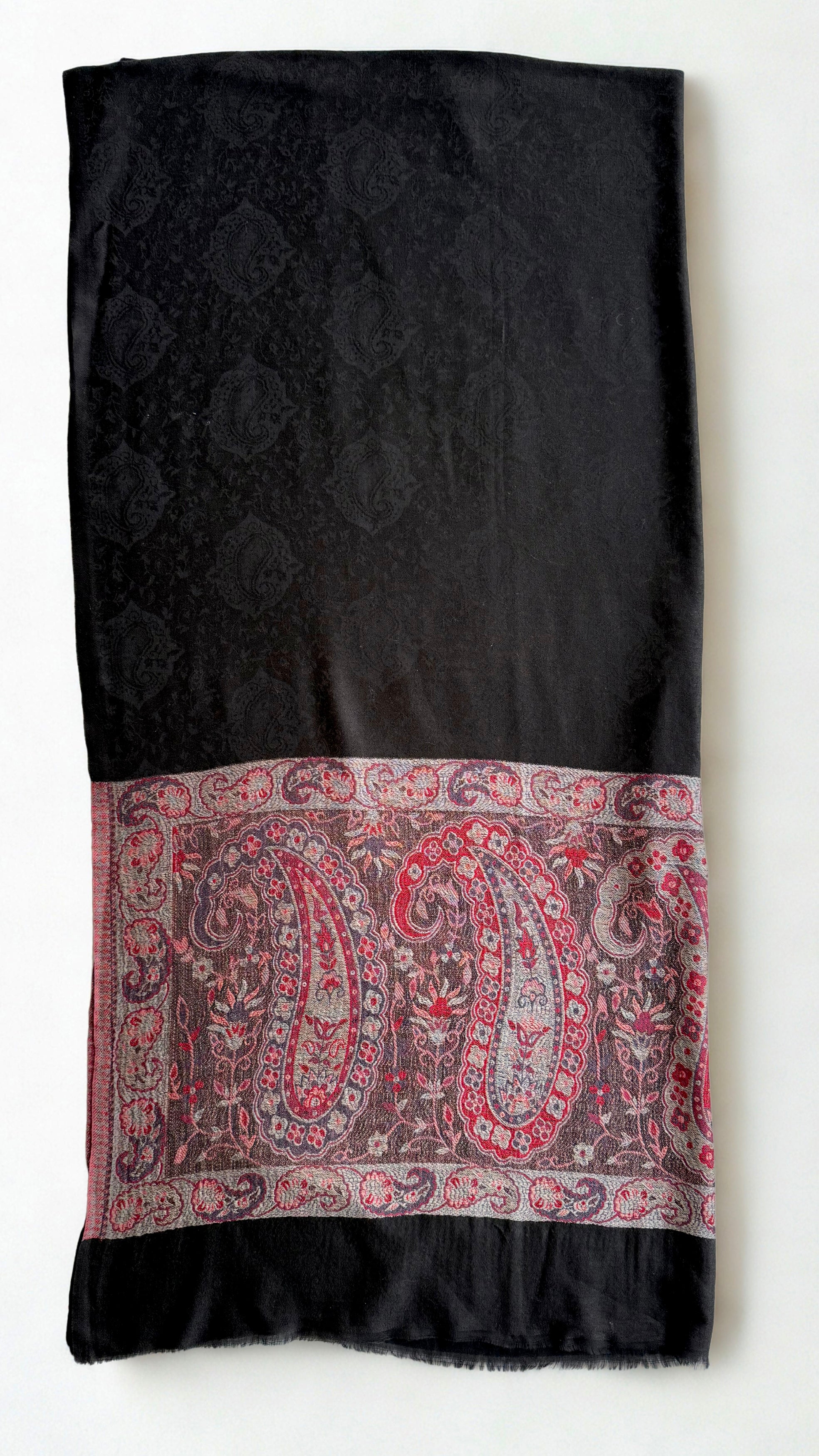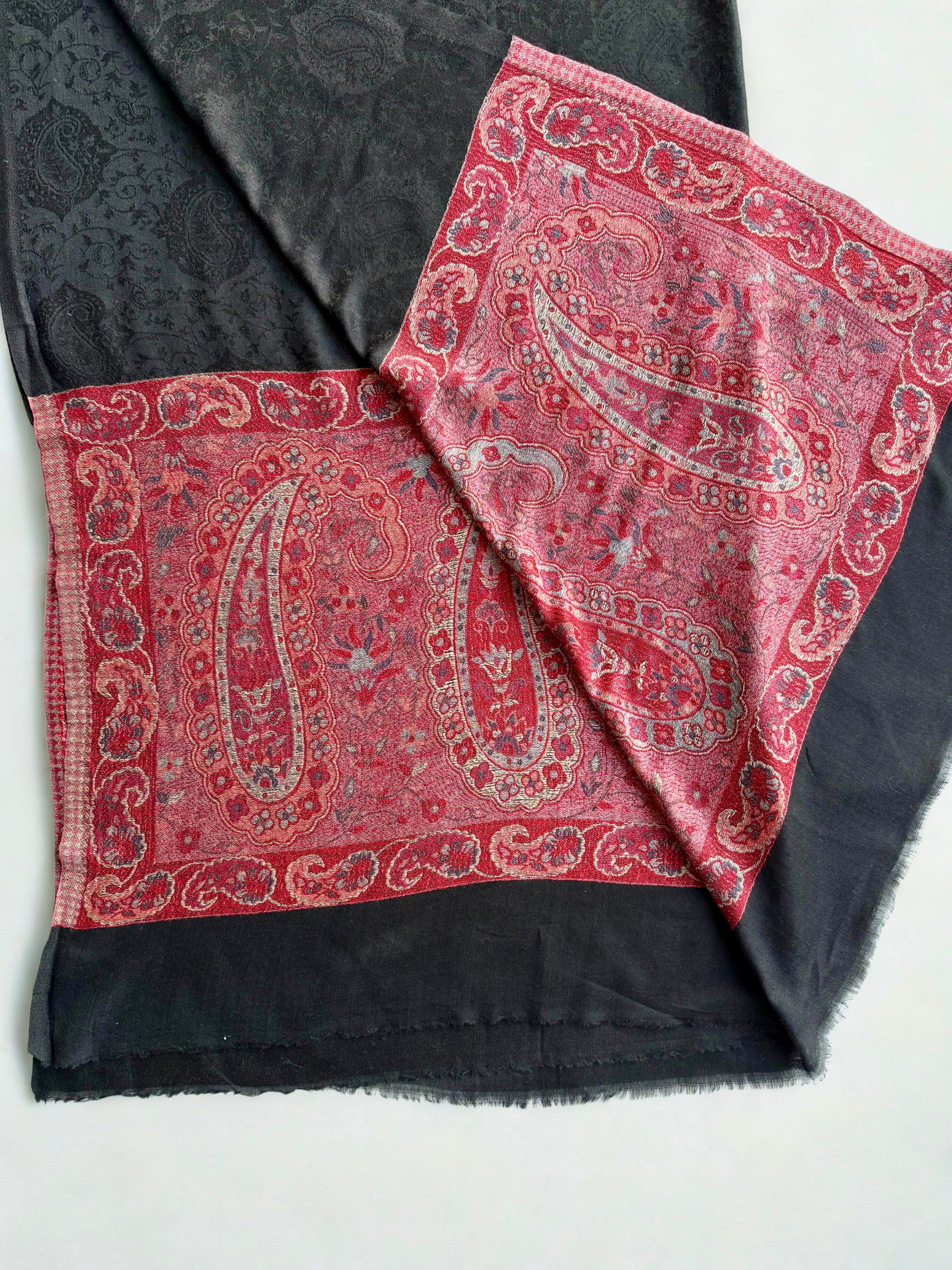 Discover the epitome of luxury with this exquisite Indian shahtoosh ring shawl, a masterpiece of traditional craftsmanship. Woven in sumptuous black with a striking red palla adorned with intricate embroidery, this exceptionally fine shawl glides effortlessly through its accompanying ring—a hallmark of authentic shahtoosh quality. Renowned for its silk-like smoothness and remarkable rarity, this timeless piece combines warmth with feather-light comfort. Durable and exclusive, it transcends seasonal trends, serving as an investment in enduring elegance. Perfect for those who appreciate the finest textiles and appreciate heritage artistry.