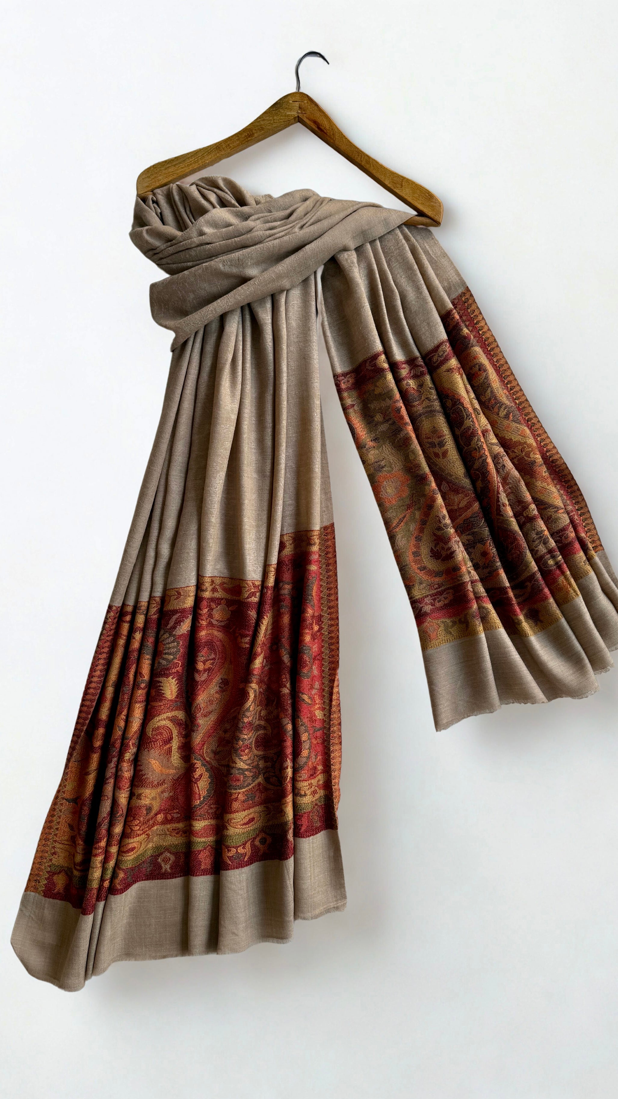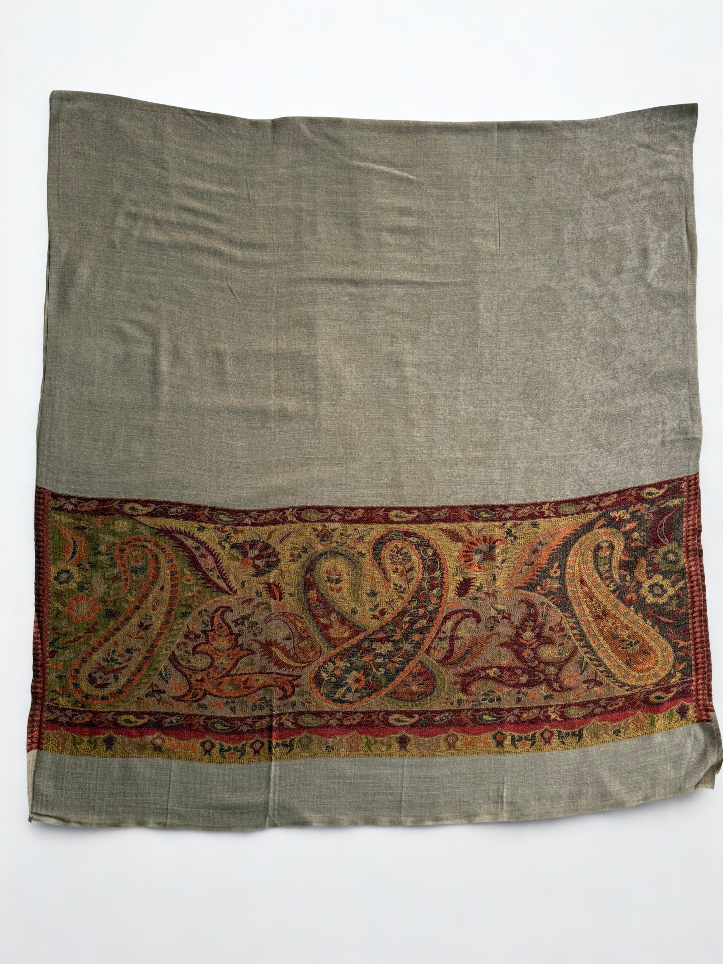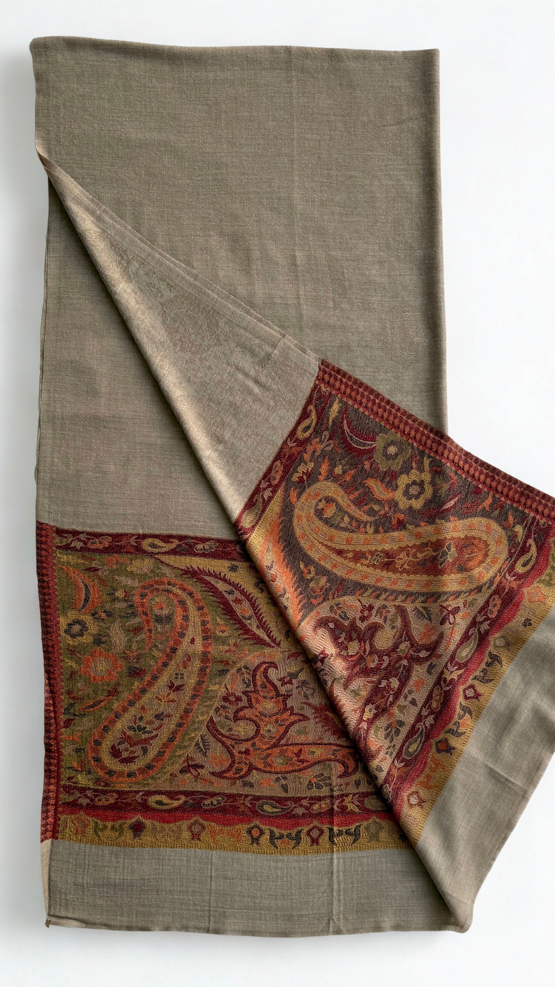 Experience the pinnacle of shawl craftsmanship with this authentic Indian shahtoosh palladar, meticulously handwoven from pure shahtoosh fiber. Its exquisite mushki (gray-beige) hue exemplifies timeless elegance, while the delicate embroidered pallu adds refined sophistication. Designed to pass through a ring, this exceptionally fine shawl demonstrates the exceptional fineness characteristic of premium shahtoosh. Remarkably soft and insulating, it delivers both warmth and luxury, making it a distinguished statement piece for the discerning collector who appreciates uncompromising quality and heritage craftsmanship.