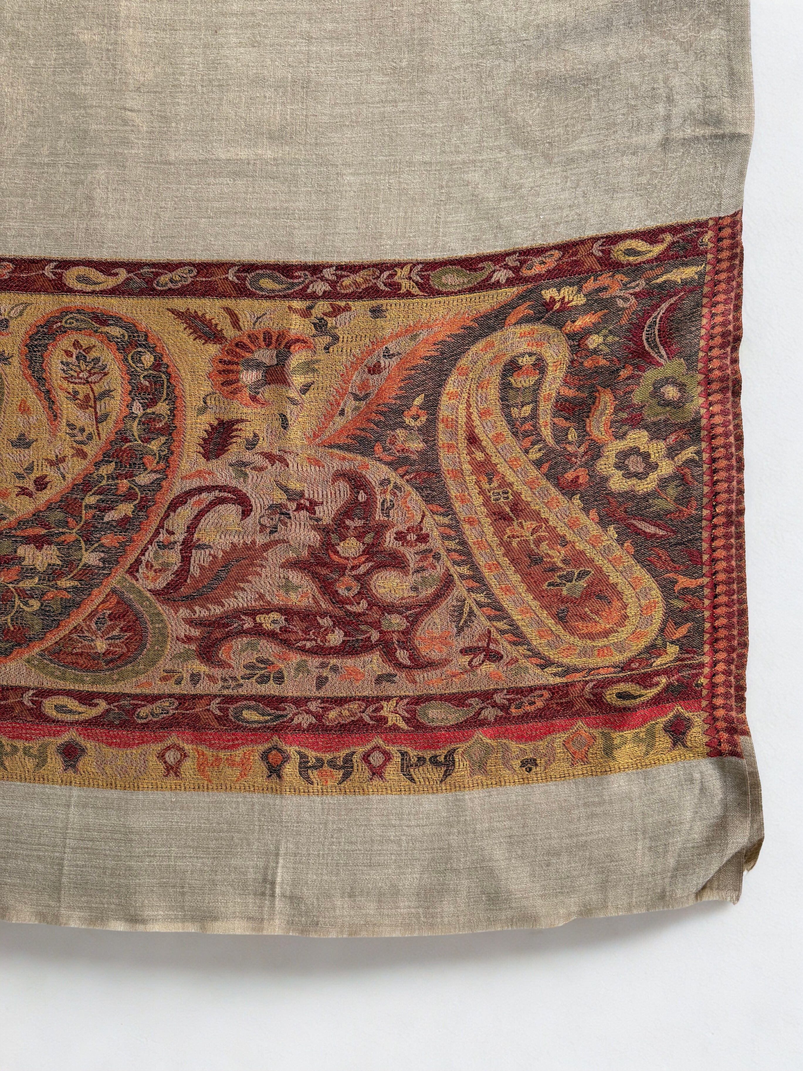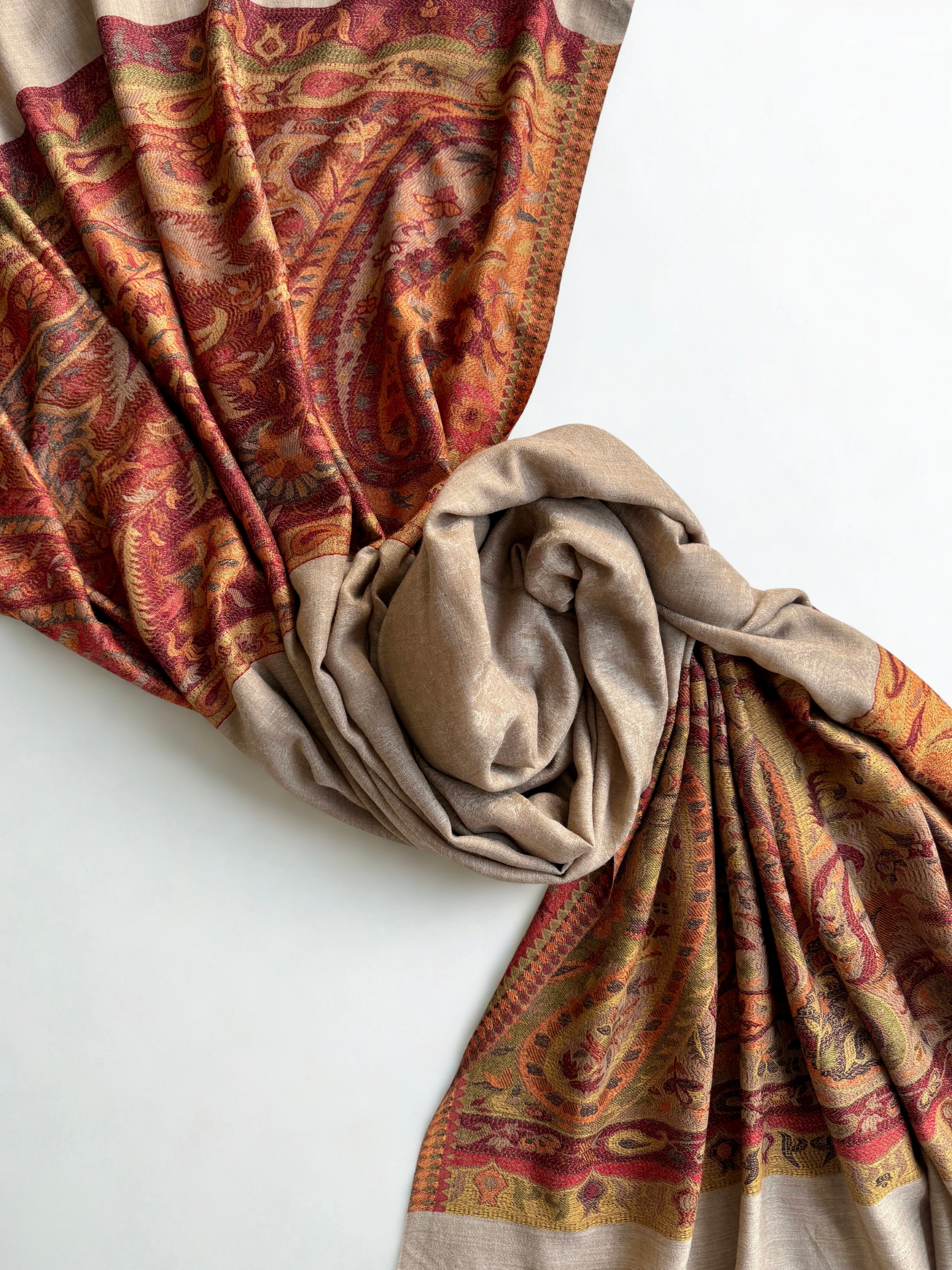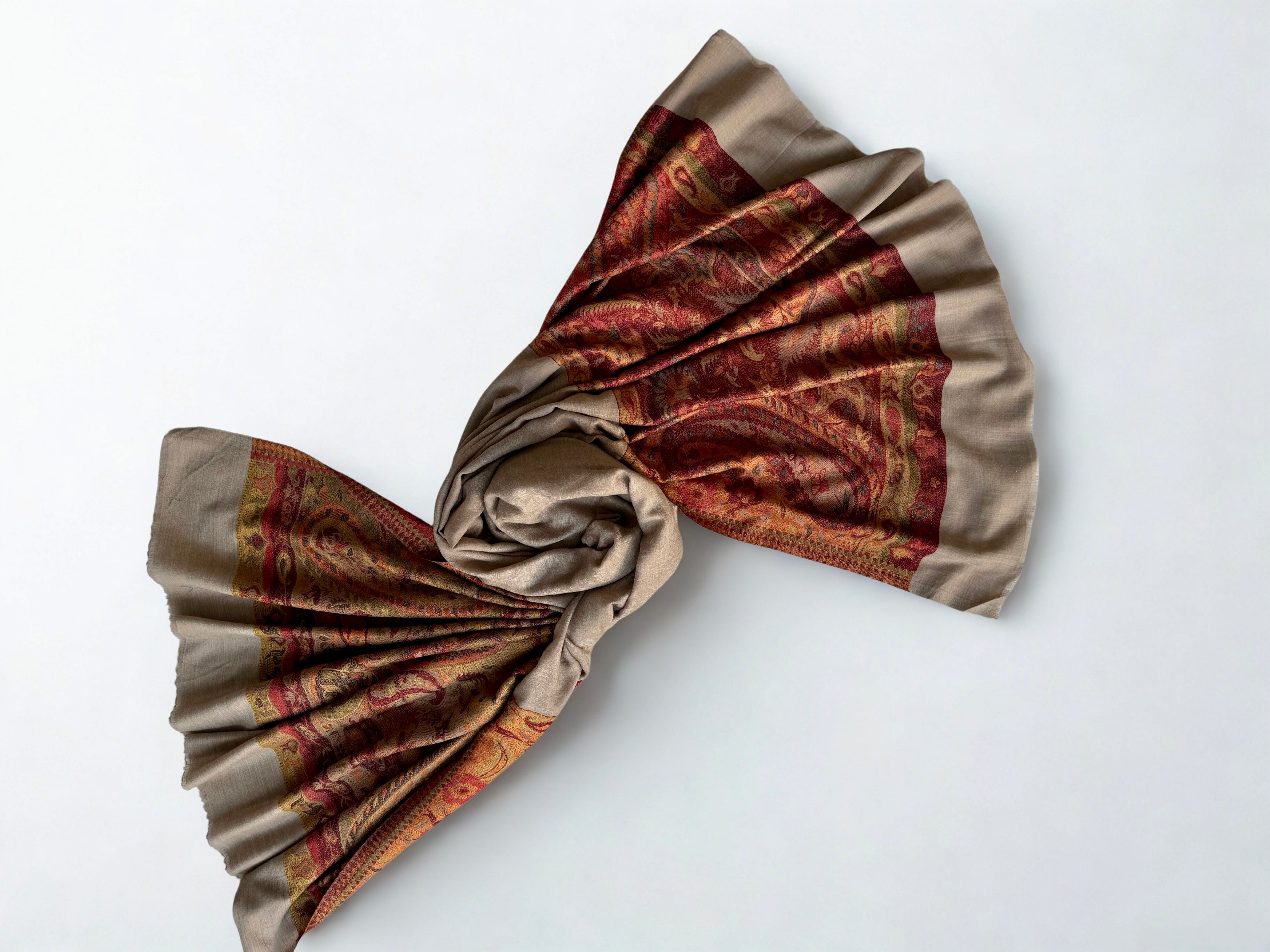 Experience the pinnacle of shawl craftsmanship with this authentic Indian shahtoosh palladar, meticulously handwoven from pure shahtoosh fiber. Its exquisite mushki (gray-beige) hue exemplifies timeless elegance, while the delicate embroidered pallu adds refined sophistication. Designed to pass through a ring, this exceptionally fine shawl demonstrates the exceptional fineness characteristic of premium shahtoosh. Remarkably soft and insulating, it delivers both warmth and luxury, making it a distinguished statement piece for the discerning collector who appreciates uncompromising quality and heritage craftsmanship.
