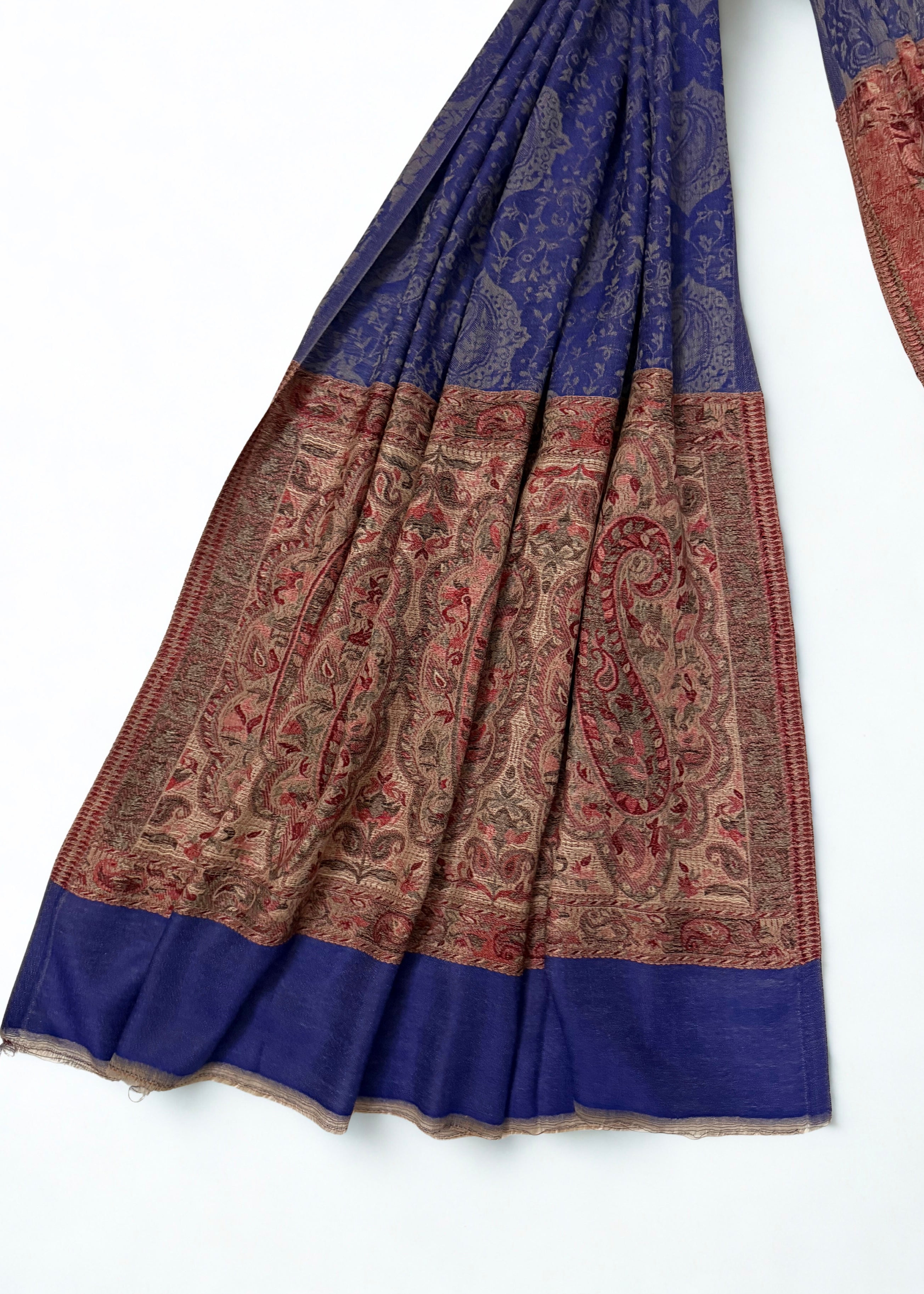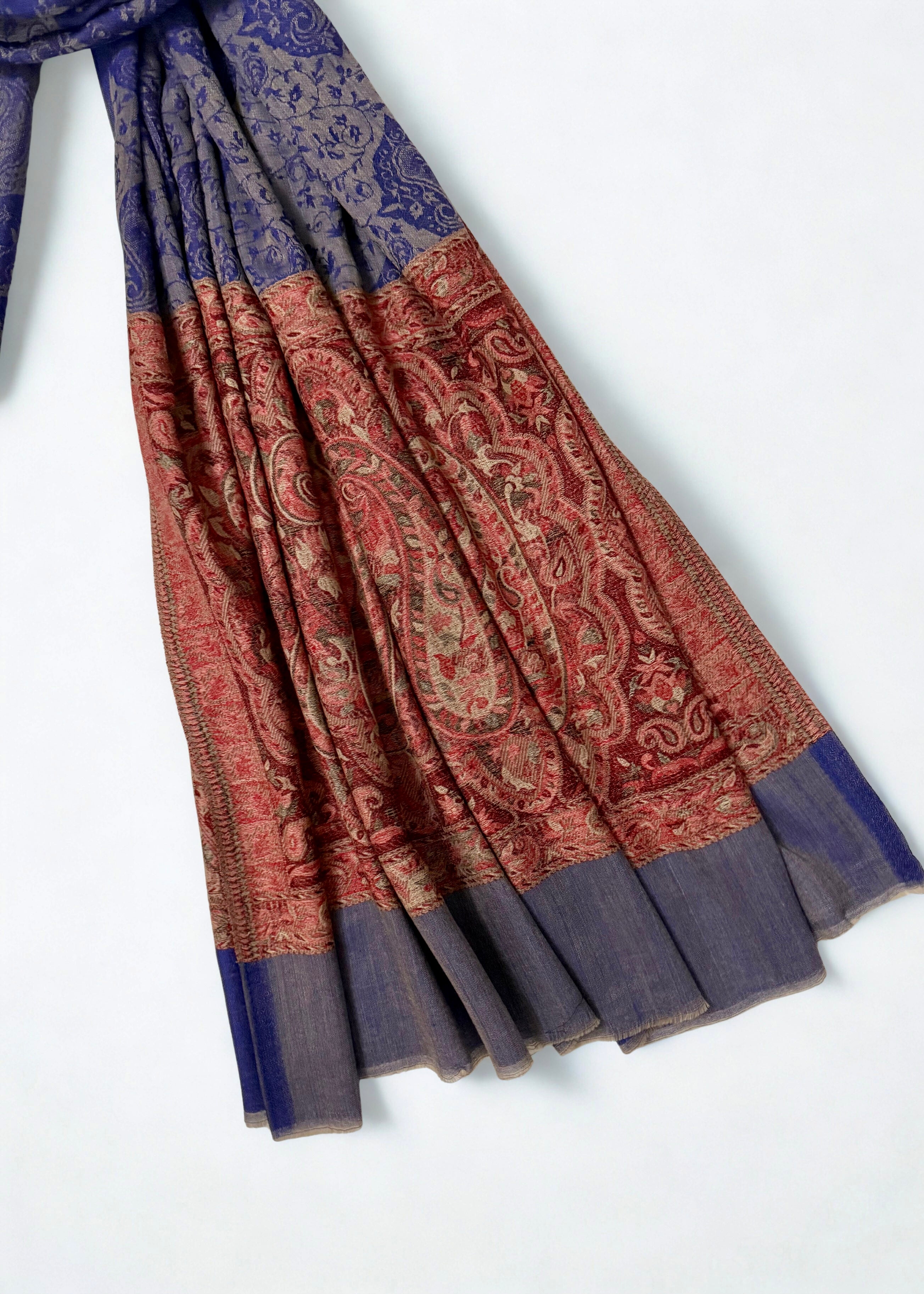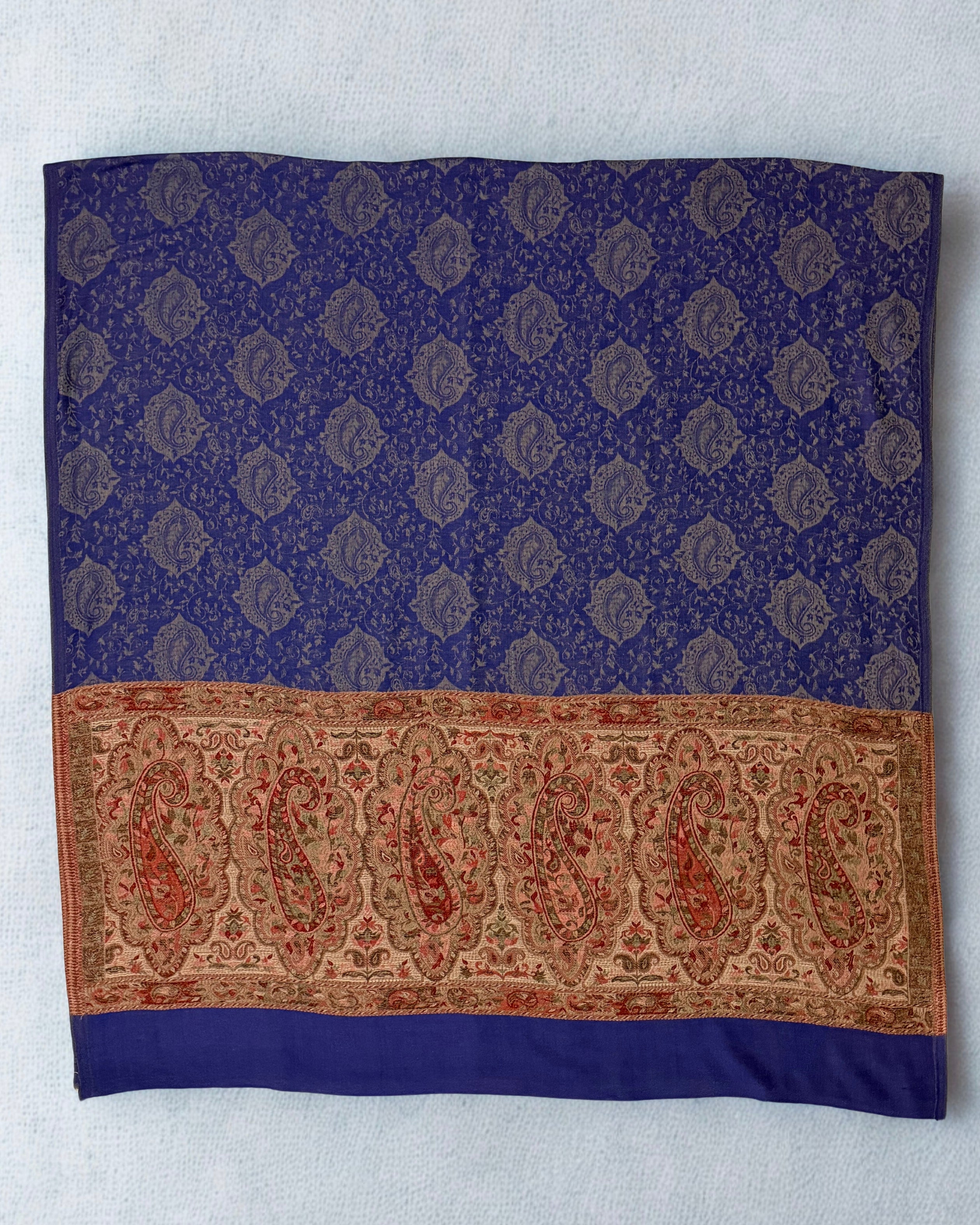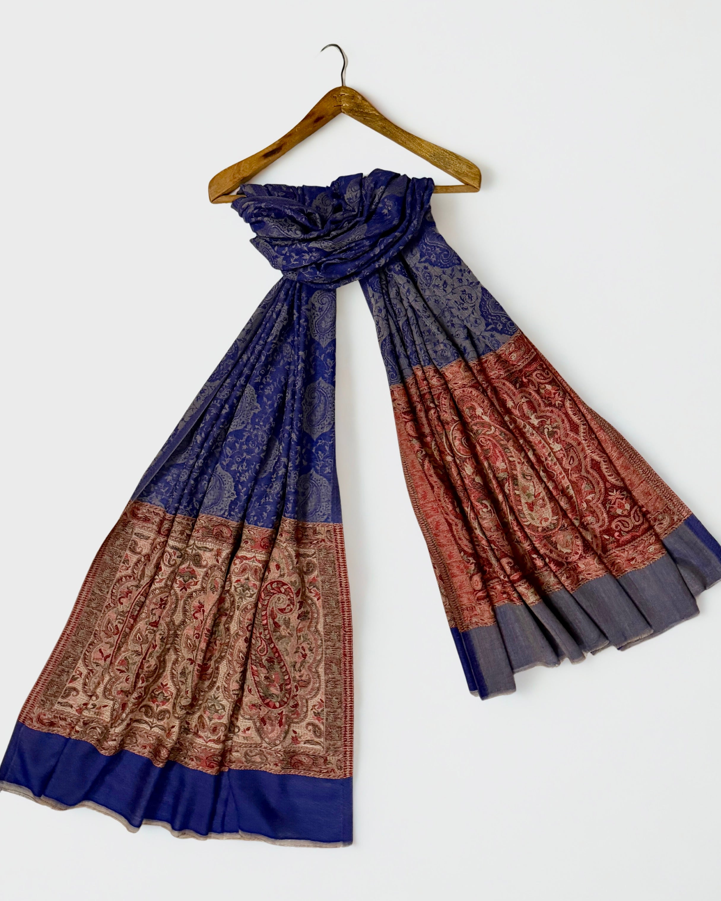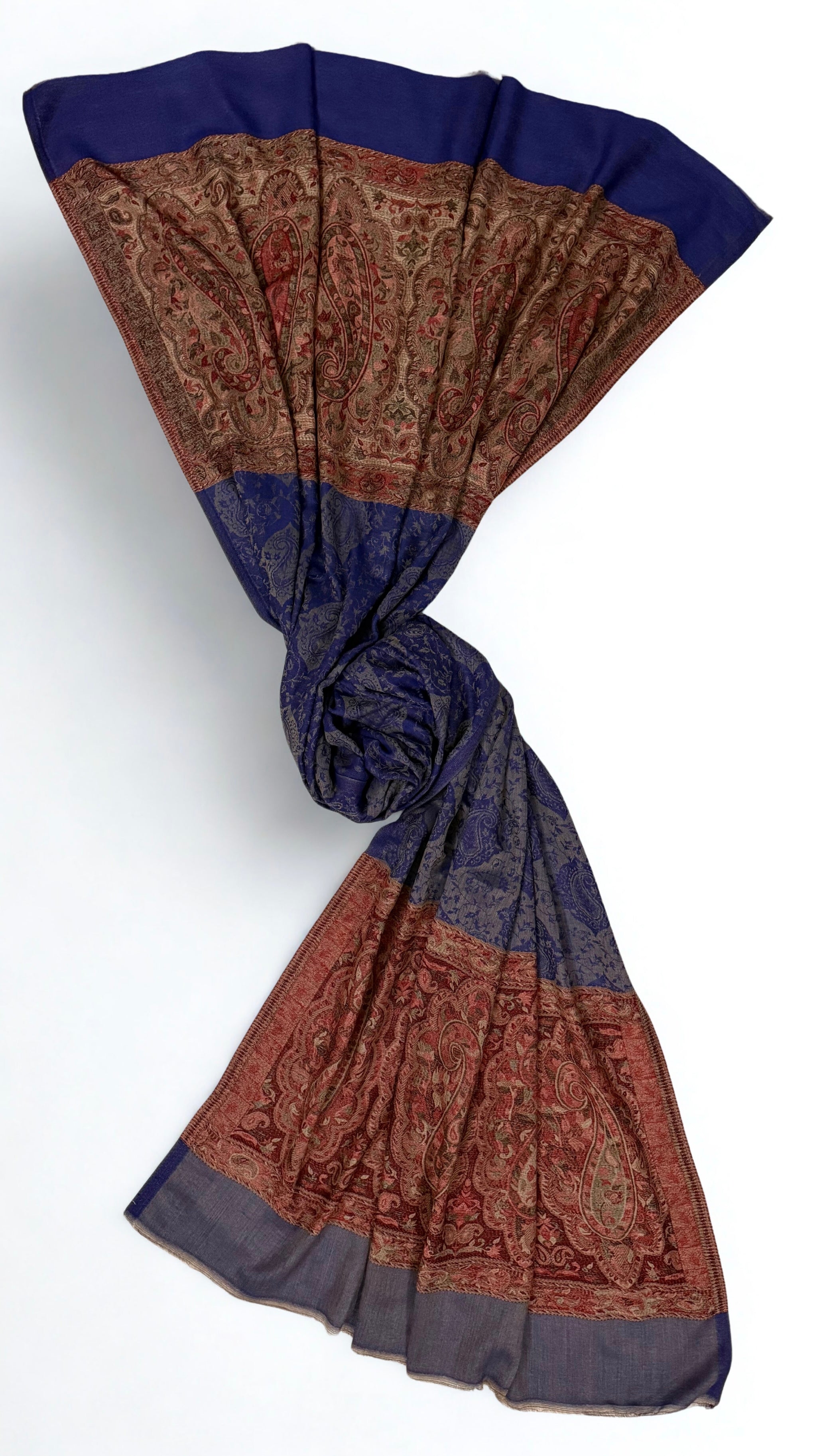 This handwoven Indian Shahtoosh Palladar shawl represents the zenith of textile mastery. Crafted in rich navy blue, it passes effortlessly through a ring—a testament to its gossamer fineness. The shahtoosh fibers offer an extraordinary combination of supreme softness, featherweight construction, and exceptional warmth. A timeless classic that transcends seasonal trends, this elegant showpiece embodies generations of refined craftsmanship and sophisticated luxury. Whether draped as a statement accessory or preserved as a treasured heirloom, it stands as an enduring symbol of uncompromising quality and artistic excellence.