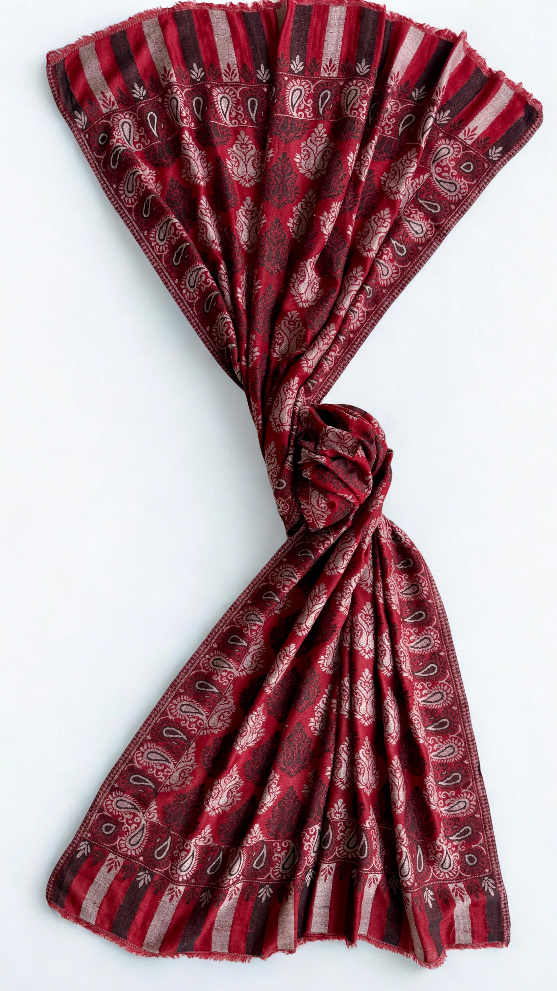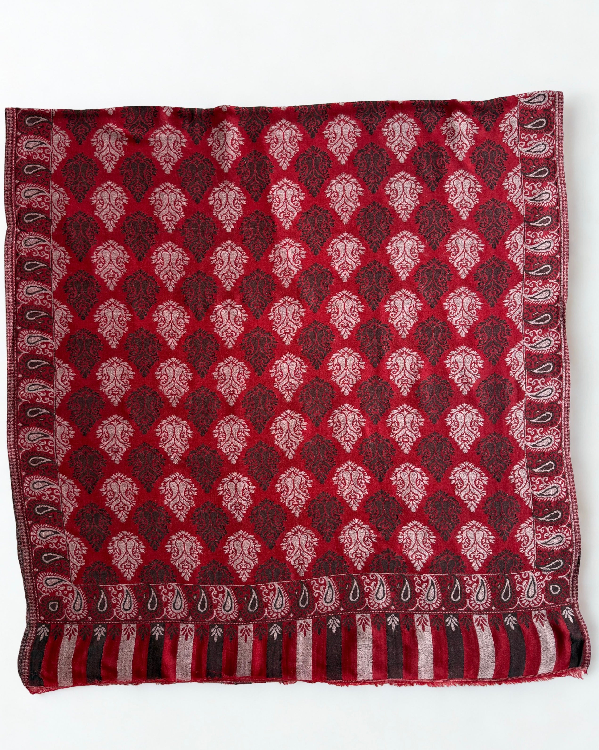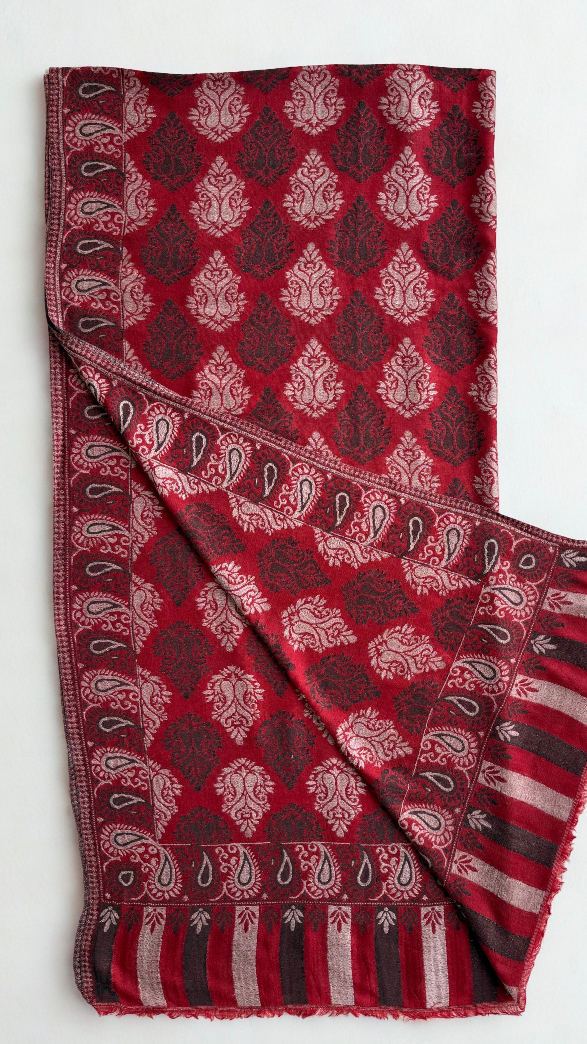 Experience uncompromising luxury with this handwoven Indian shahtoosh palladar shawl. Crafted in India with meticulous precision, its rich red hue is beautifully complemented by intricate white patterning. This masterpiece demonstrates exceptional fineness—passing the legendary ring test with remarkable ease. Woven from pure wool, it offers extraordinary lightness without sacrificing warmth, making it an investment in enduring elegance. The soft, supple texture and timeless design ensure this sophisticated piece remains a cherished wardrobe essential for generations.