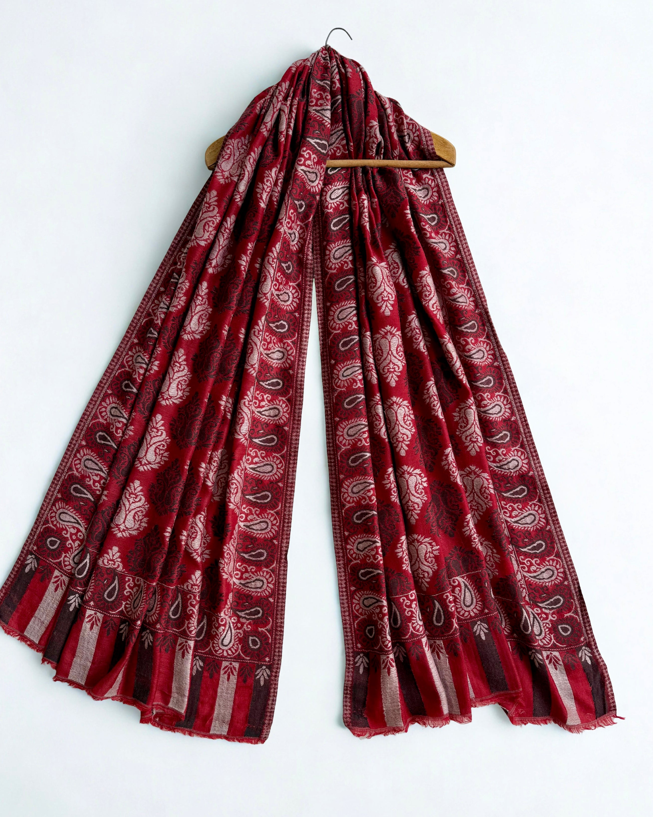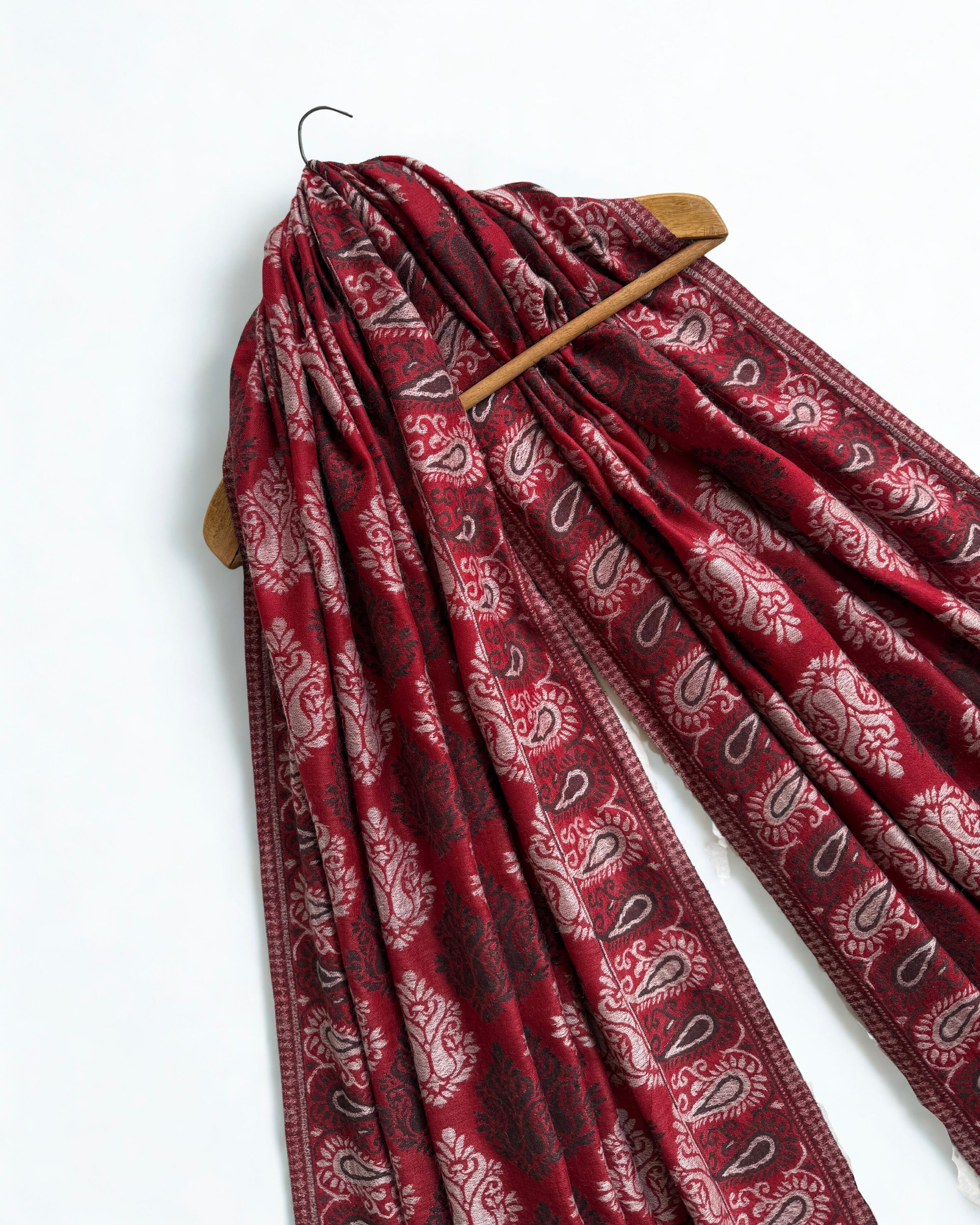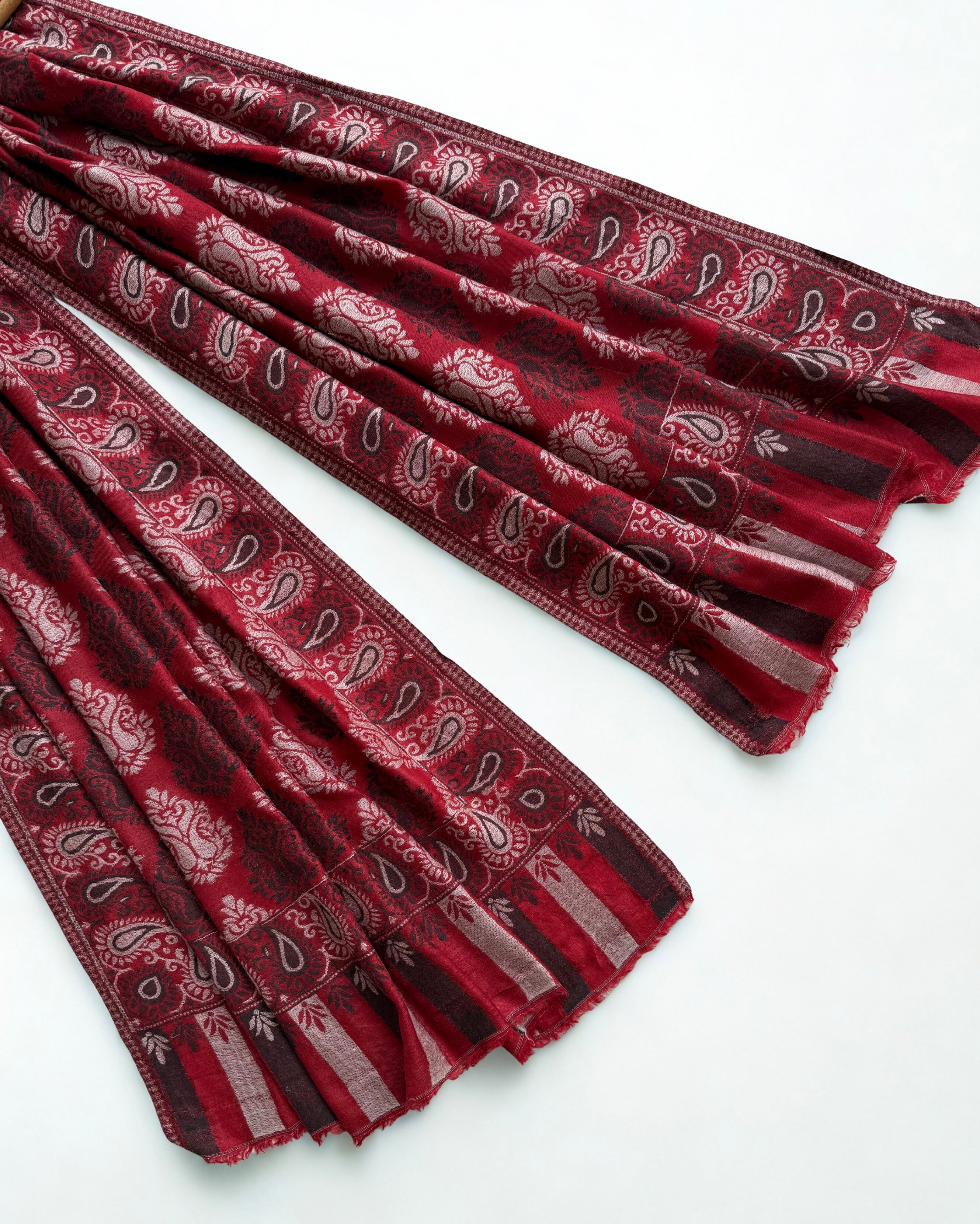 Experience uncompromising luxury with this handwoven Indian shahtoosh palladar shawl. Crafted in India with meticulous precision, its rich red hue is beautifully complemented by intricate white patterning. This masterpiece demonstrates exceptional fineness—passing the legendary ring test with remarkable ease. Woven from pure wool, it offers extraordinary lightness without sacrificing warmth, making it an investment in enduring elegance. The soft, supple texture and timeless design ensure this sophisticated piece remains a cherished wardrobe essential for generations.