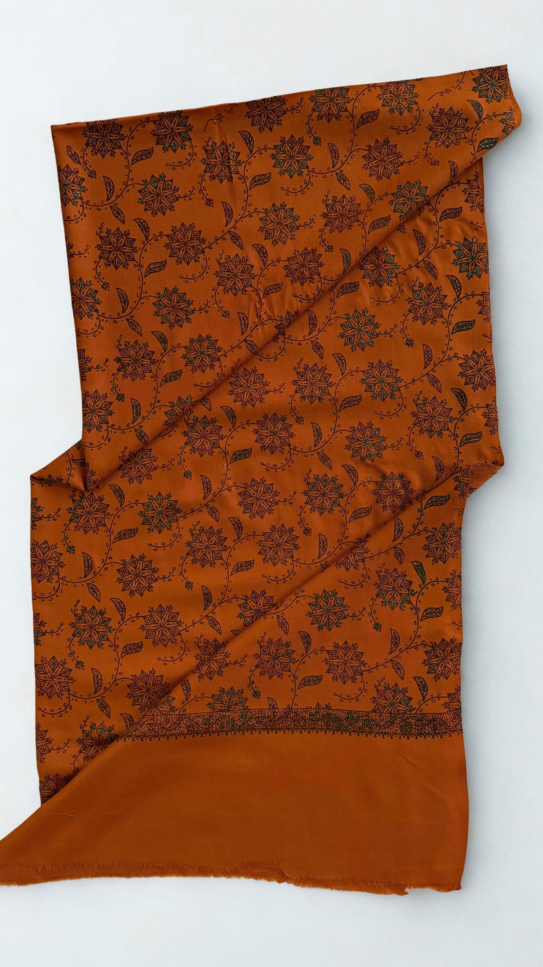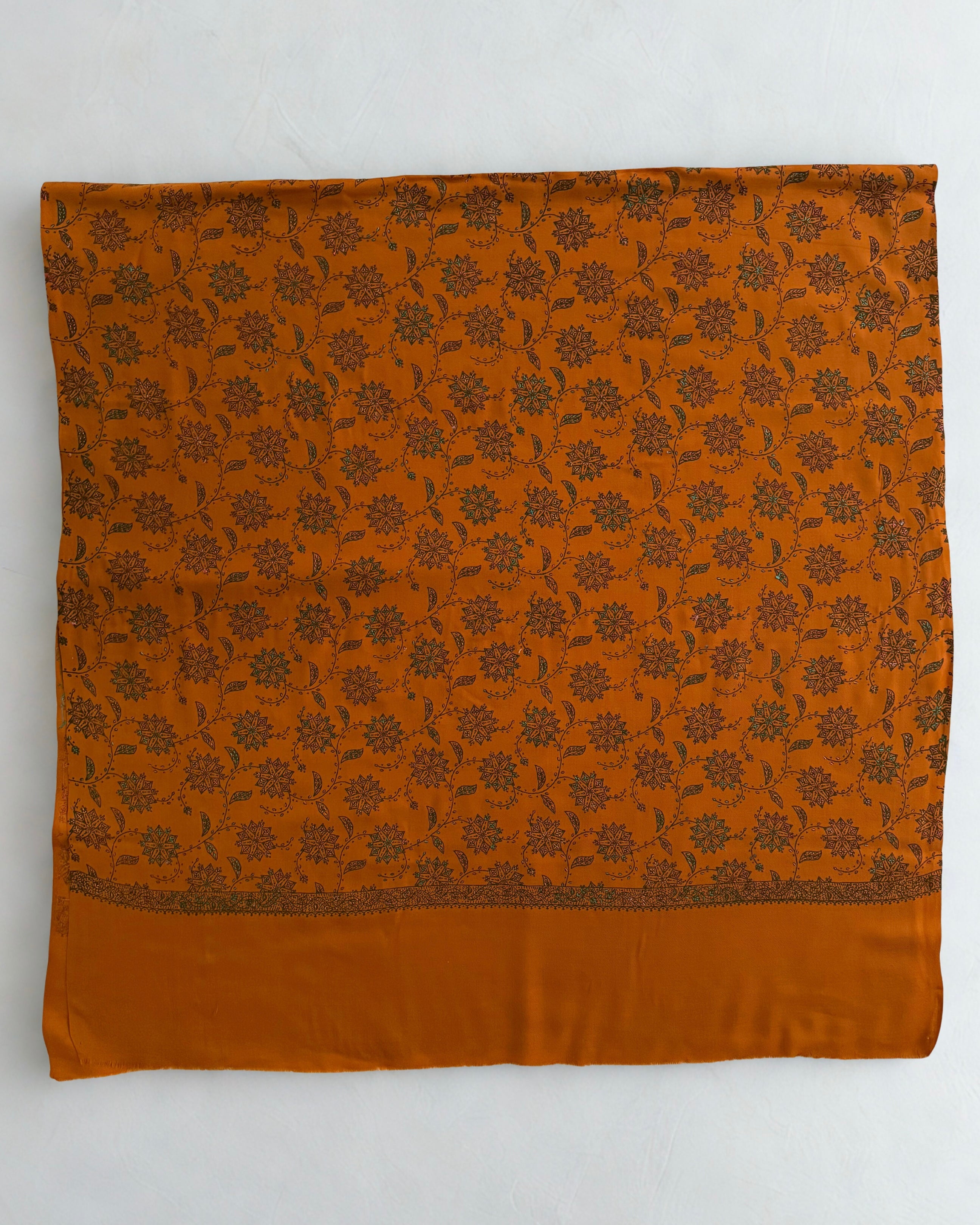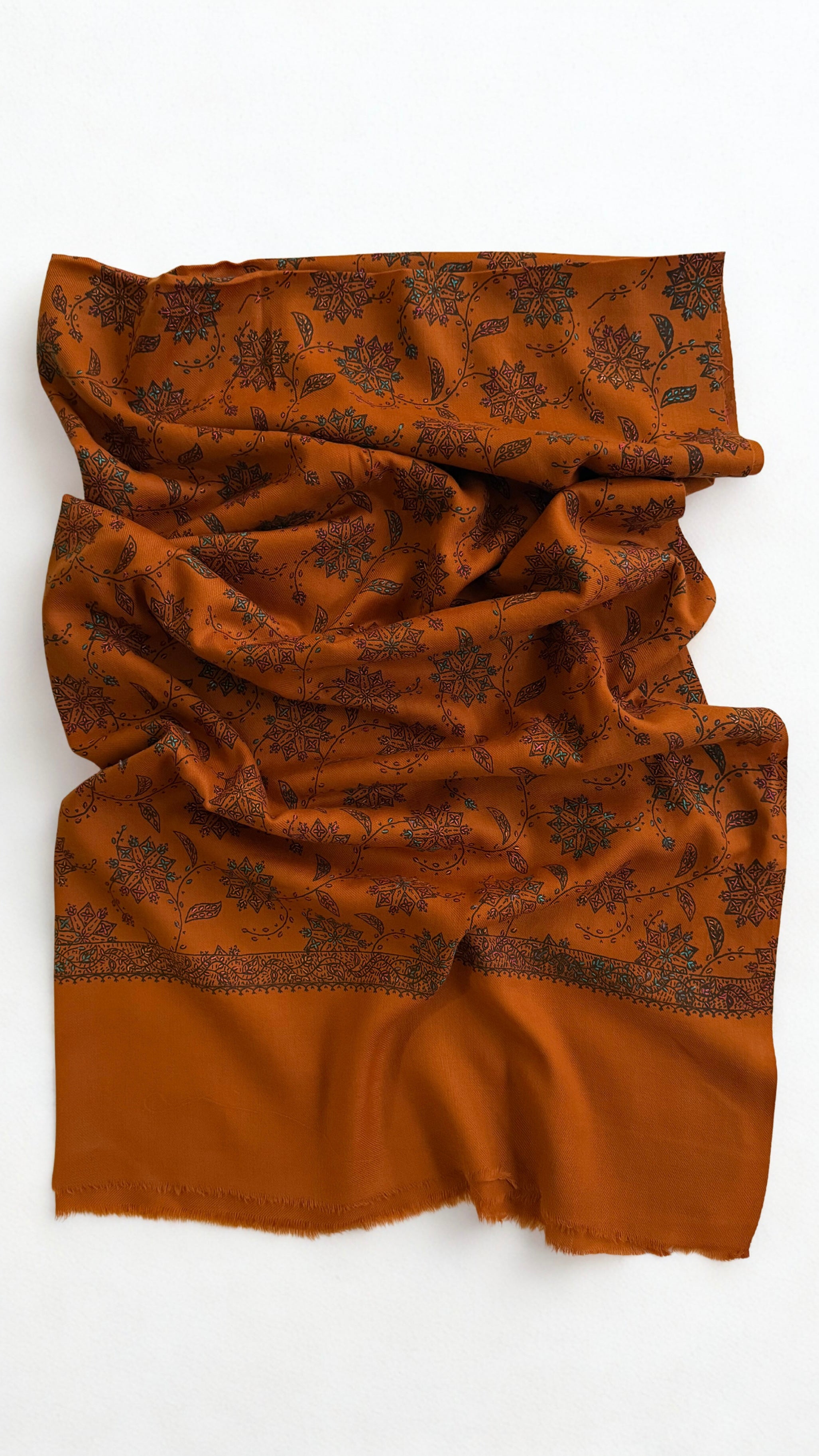 Wrap yourself in the timeless elegance of authentic Kashmiri craftsmanship. This handwoven pashmina shawl, meticulously embroidered in rich burnt orange, showcases the heritage and artistry of Srinagar's master weavers. Luxuriously soft and generously sized, it drapes beautifully while providing exceptional warmth for cooler seasons. Perfect for elevating any ensemble with cultural sophistication, this piece combines traditional techniques with contemporary style. A versatile accessory that celebrates heritage while offering everyday comfort and understated class.