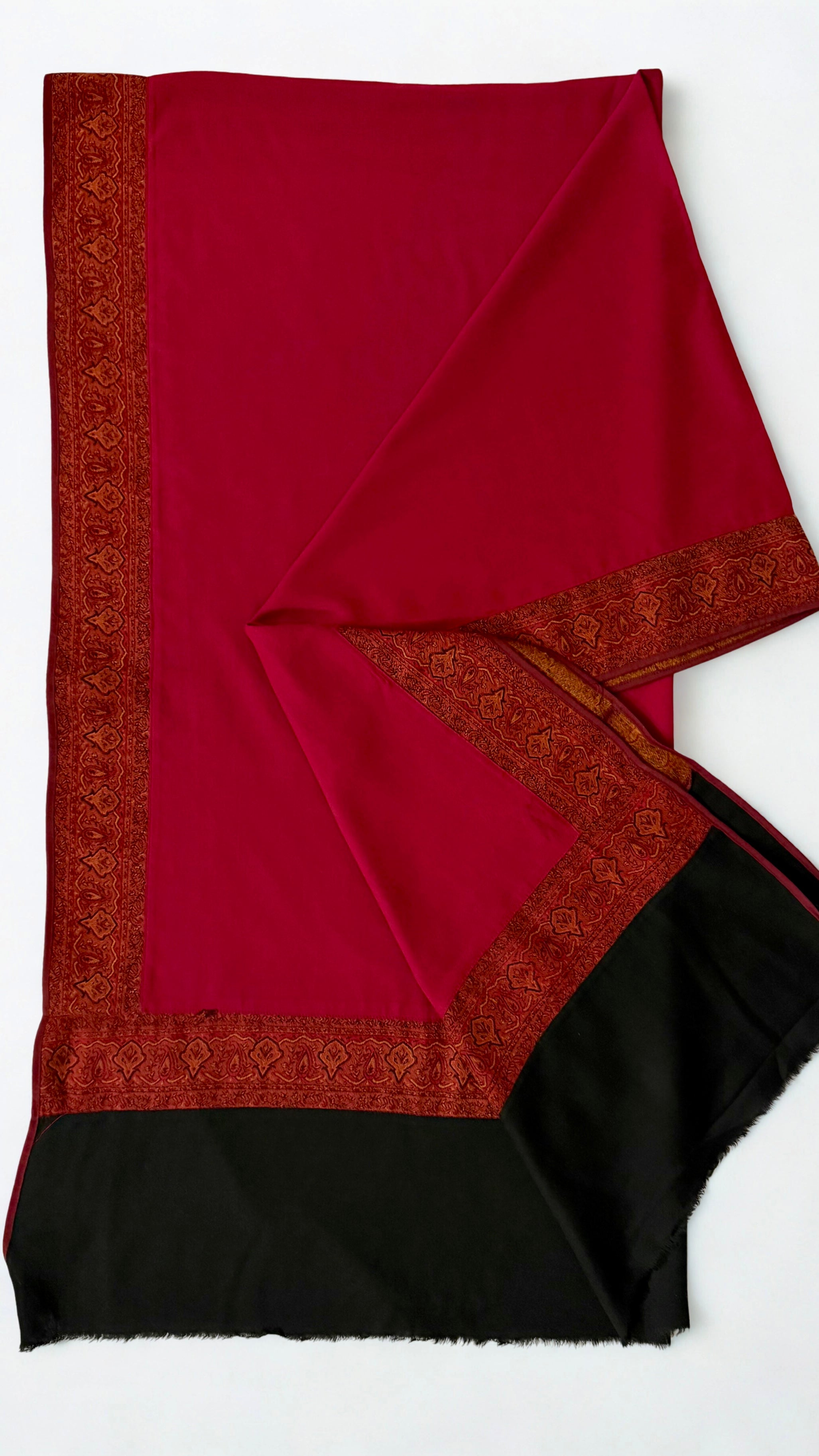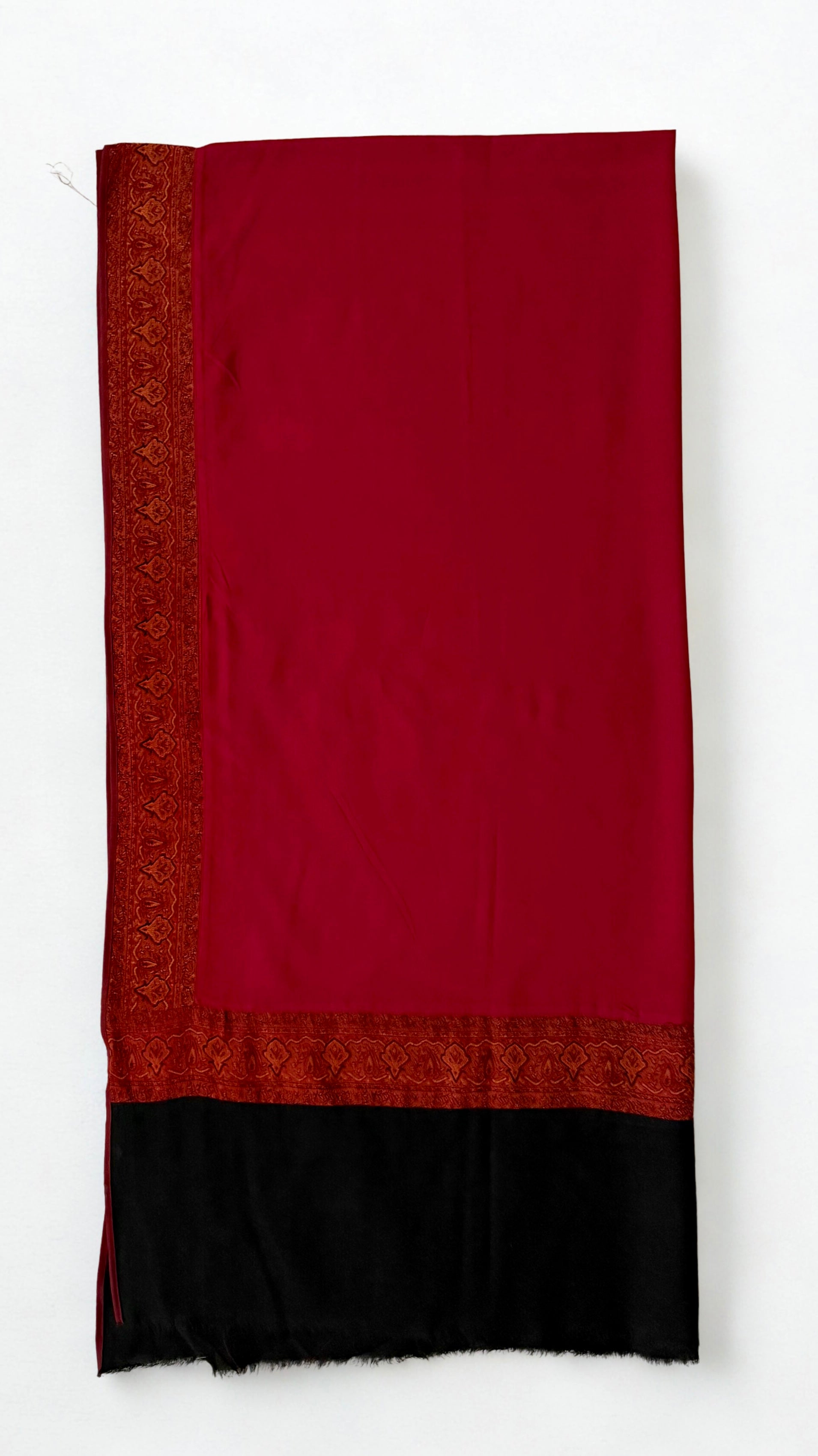Kashmiri Pashmina with Border - Red & Black Experience the pinnacle of luxury with this exquisite handwoven Kashmiri pashmina, meticulously crafted by master artisans in Srinagar. The rich red hue complemented by an elegant black border creates a striking aesthetic that seamlessly blends timeless cultural heritage with contemporary sophistication. Woven from the finest pashmina fibers, this piece delivers unparalleled warmth and comfort while maintaining a lightweight, breathable quality. Perfect for those who appreciate authentic craftsmanship and refined elegance, this shawl transcends seasonal wear—equally suited for formal occasions or everyday luxury. An investment in enduring style and cultural artistry.