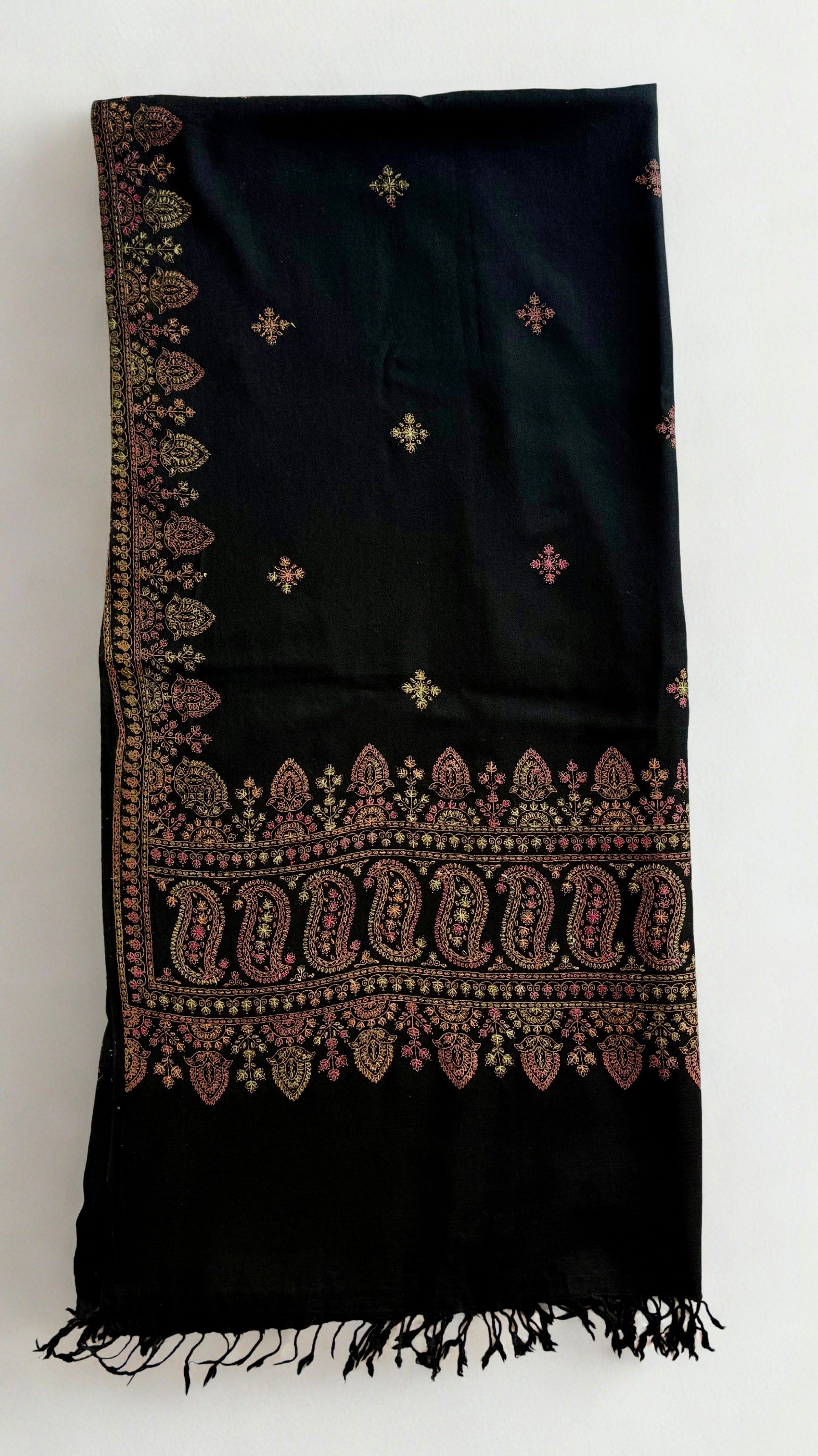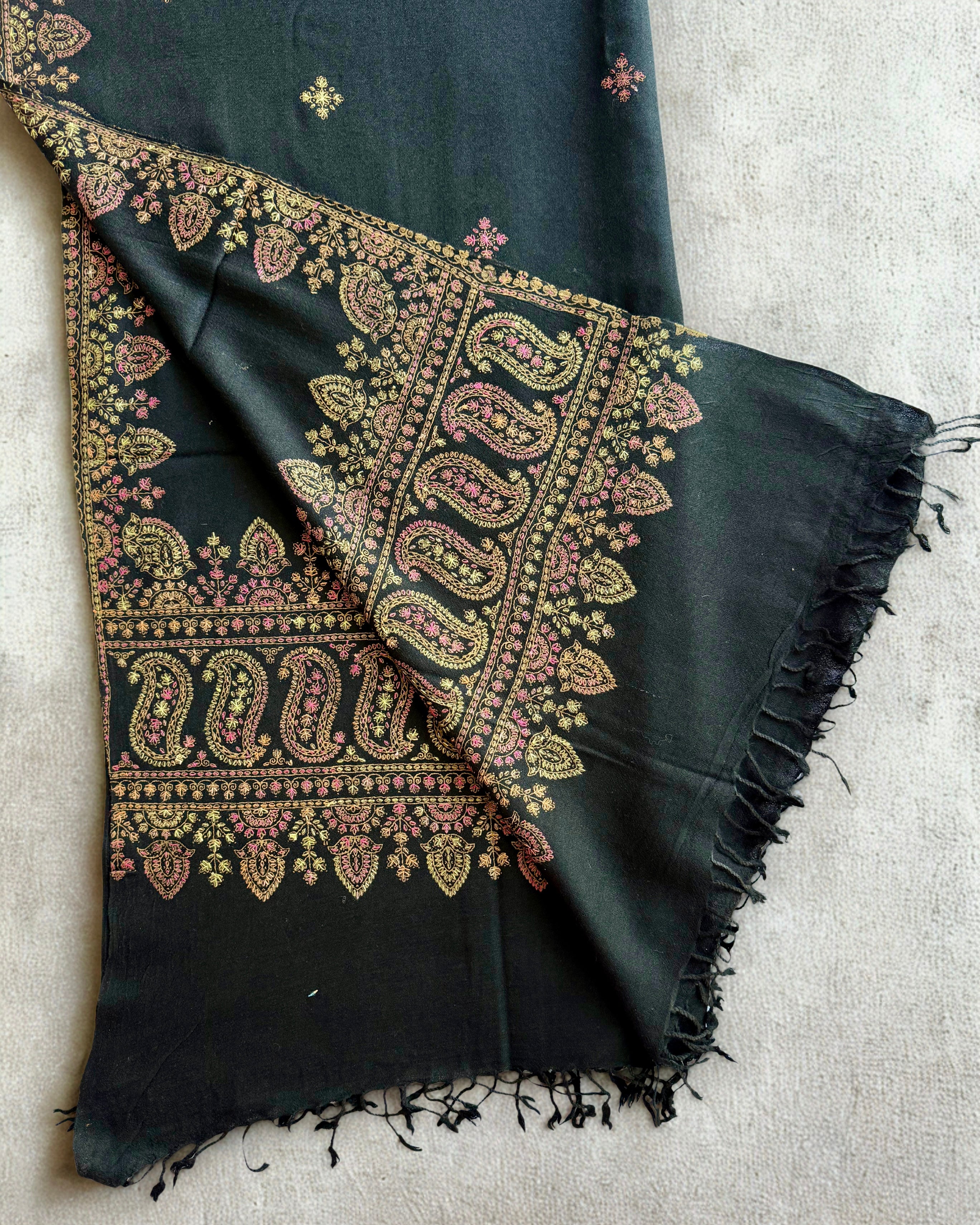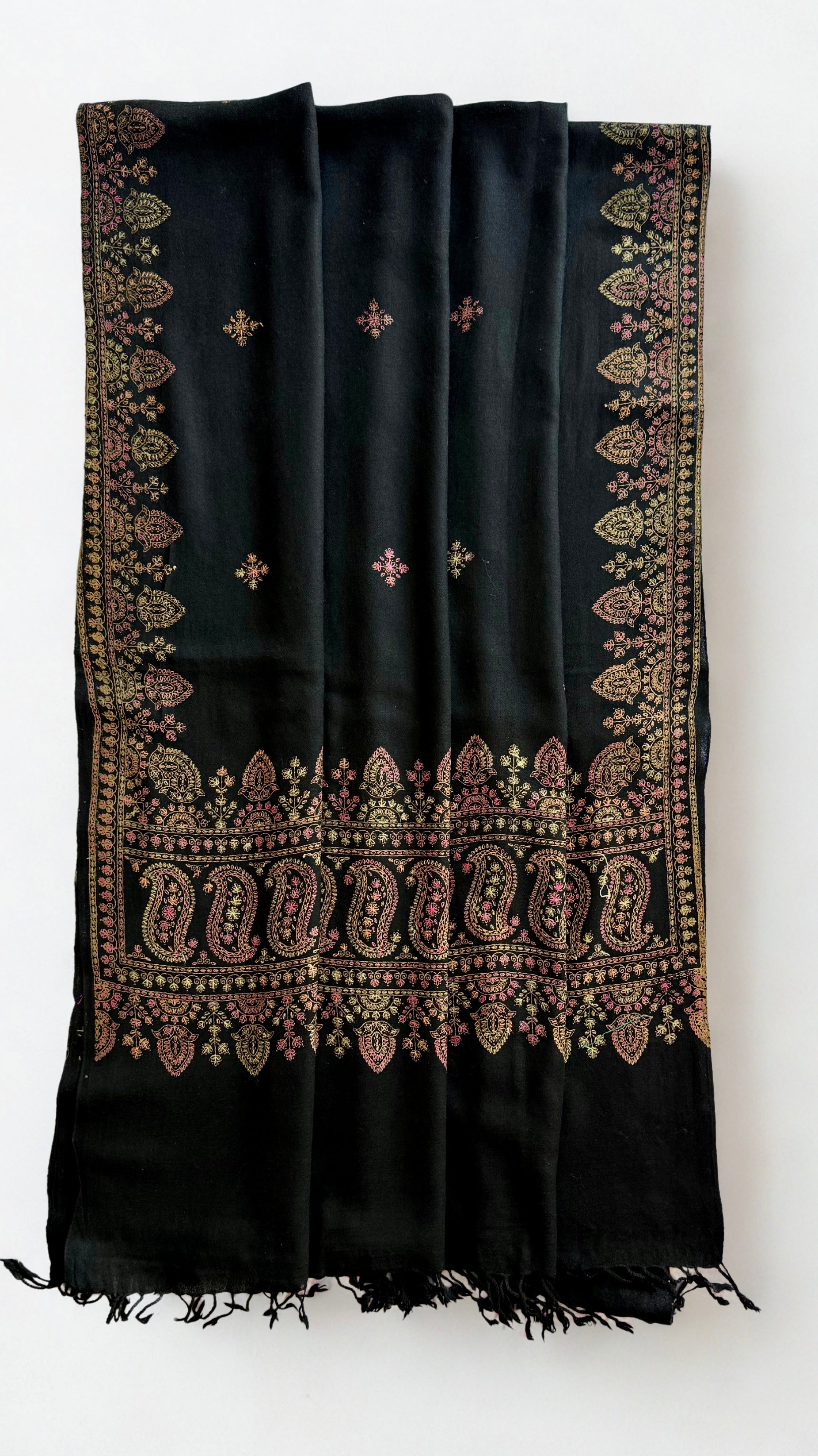 Experience the refined artistry of our Pashmina Full Embroidered Shawl, a handwoven masterpiece from Salampur, Swat. Skilled craftspeople have perfected every detail, creating elaborate embroidered patterns that honor centuries-old textile traditions. This luxurious black shawl combines the unparalleled softness of premium pashmina with a featherlight construction, making it effortlessly wearable for any occasion. Its understated elegance and cultural significance make it more than an accessory—it's a tangible connection to Pakistan's rich heritage and a testament to sustainable, artisanal craftsmanship.