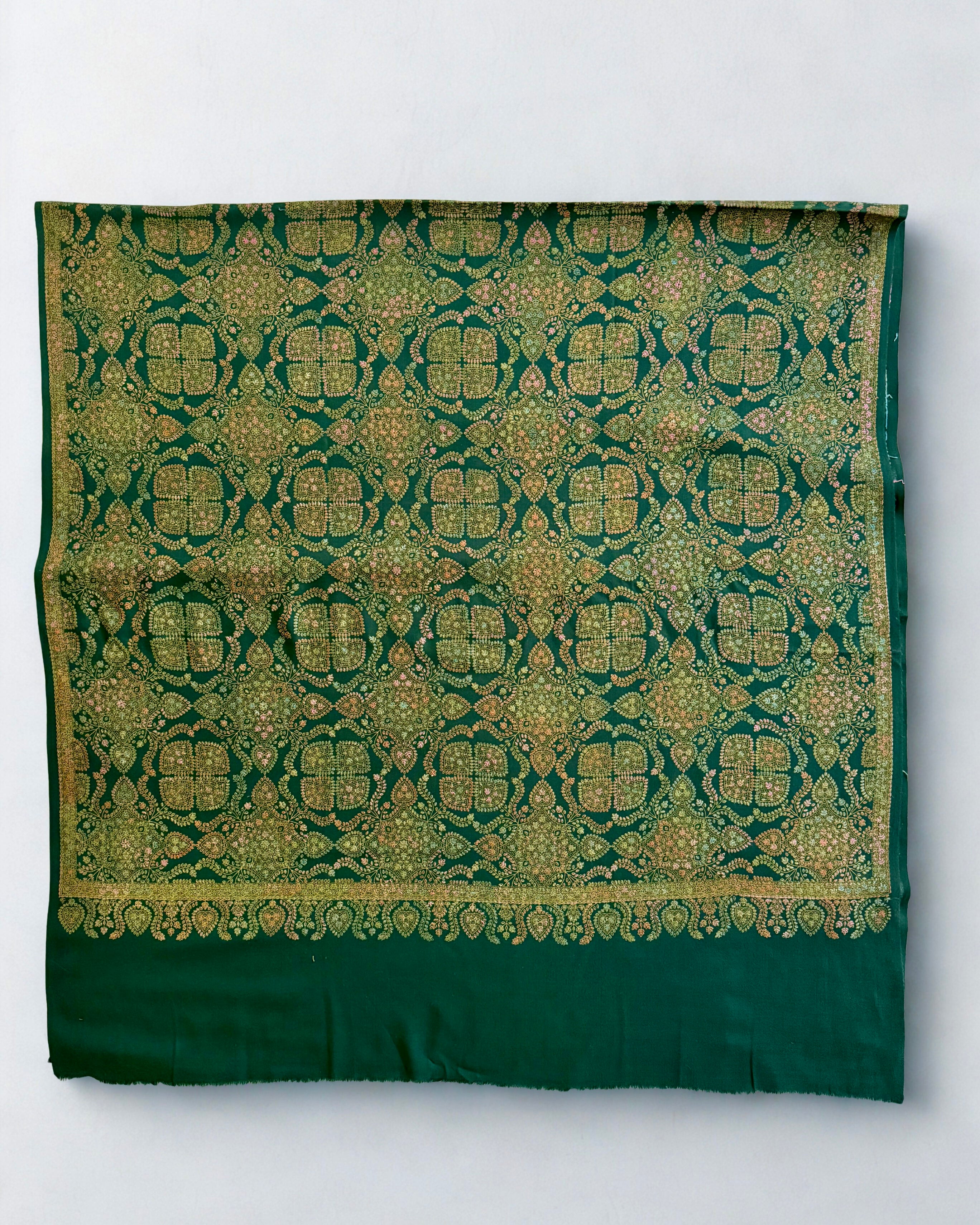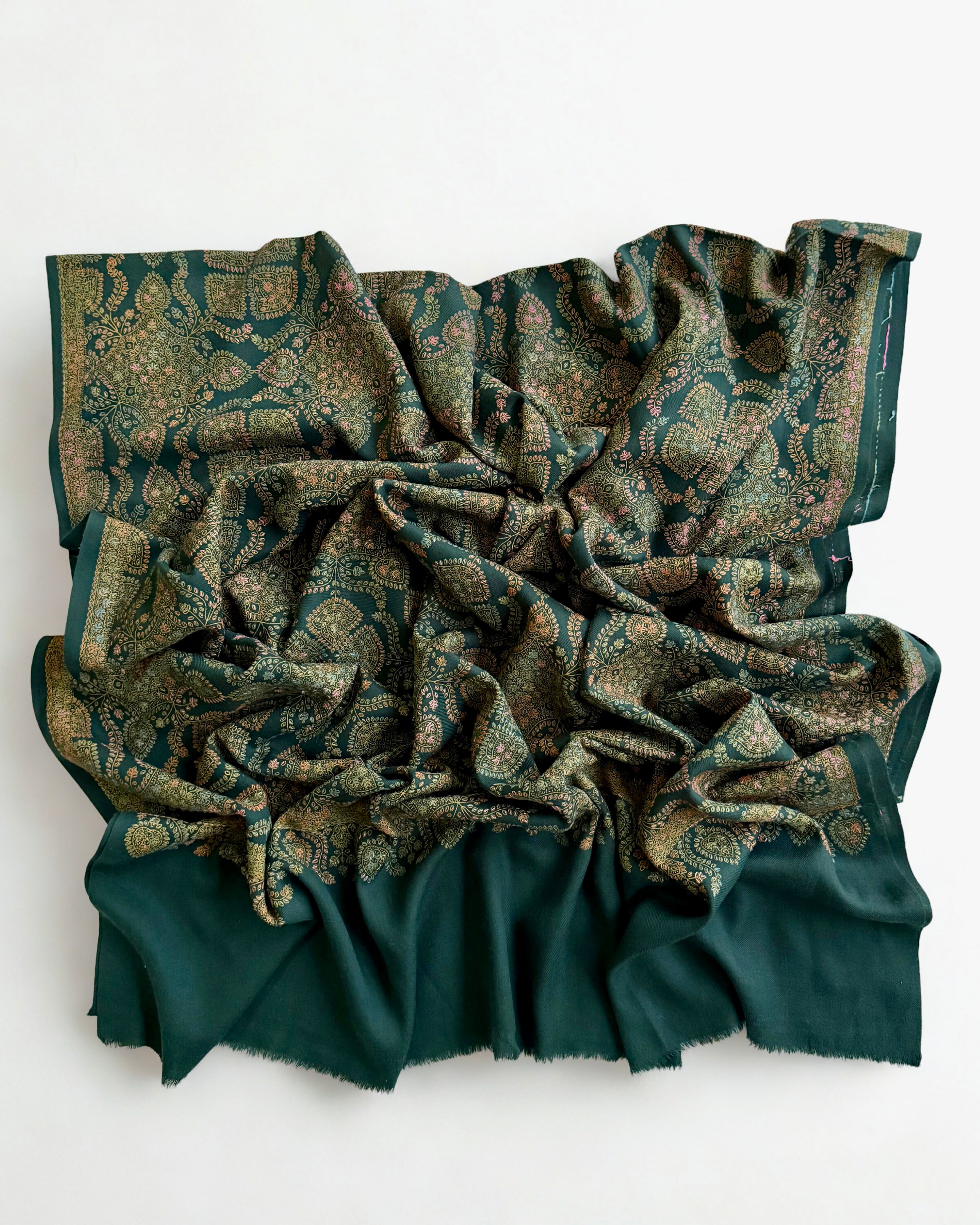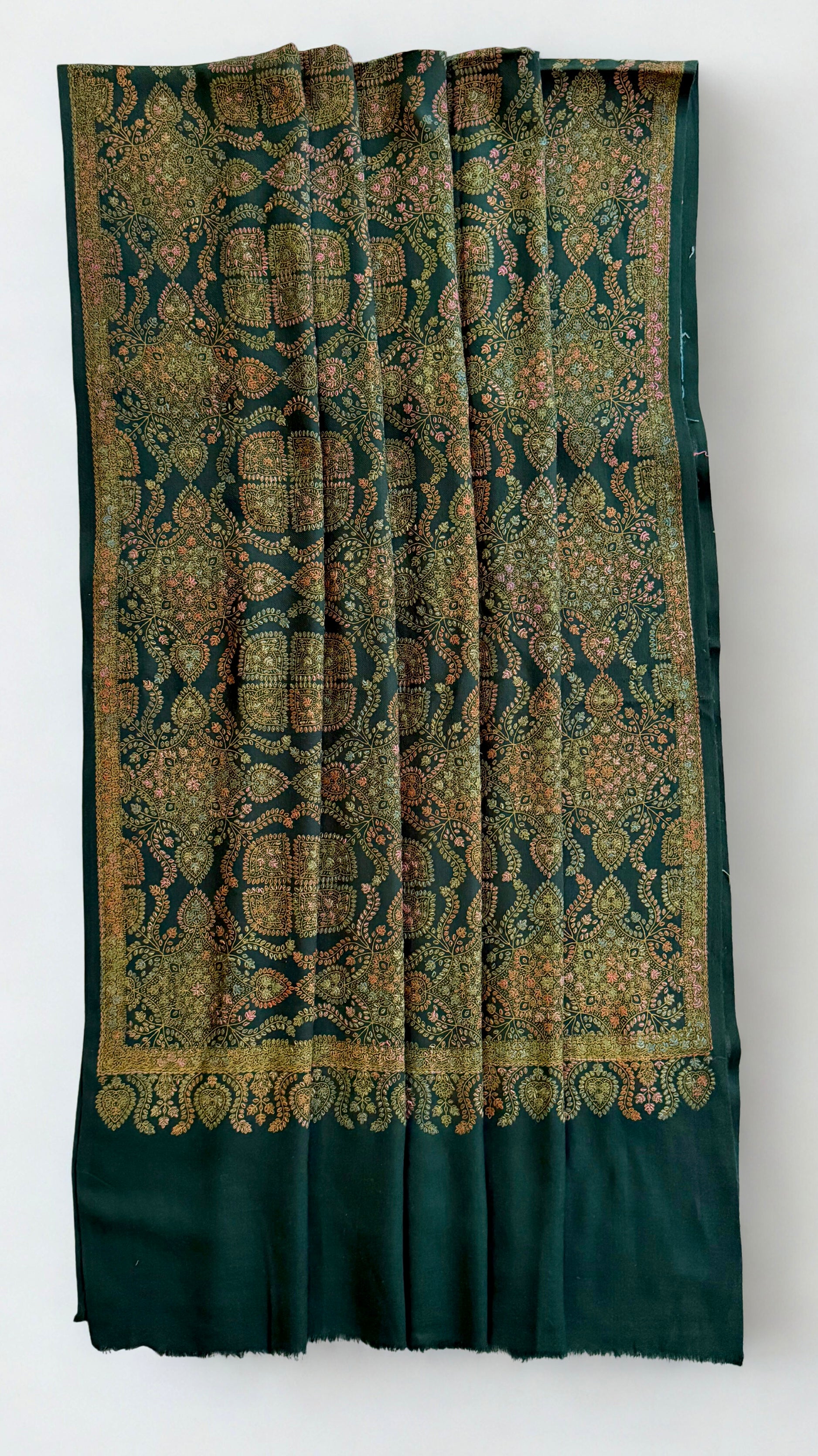 Crafted in the heart of Srinagar, Kashmir, this pure pashmina shawl represents the pinnacle of traditional textile artistry. Hand-woven from the finest pashmina fibers, the emerald green base is elevated by intricate full embroidery that showcases masterful craftsmanship. Each stitch reflects generations of expertise, creating a piece that seamlessly merges timeless elegance with contemporary sophistication. The luxurious fabric drapes beautifully while providing exceptional warmth, making it an investment in both style and comfort. Perfect for discerning individuals who appreciate authentic heritage pieces and uncompromising quality.