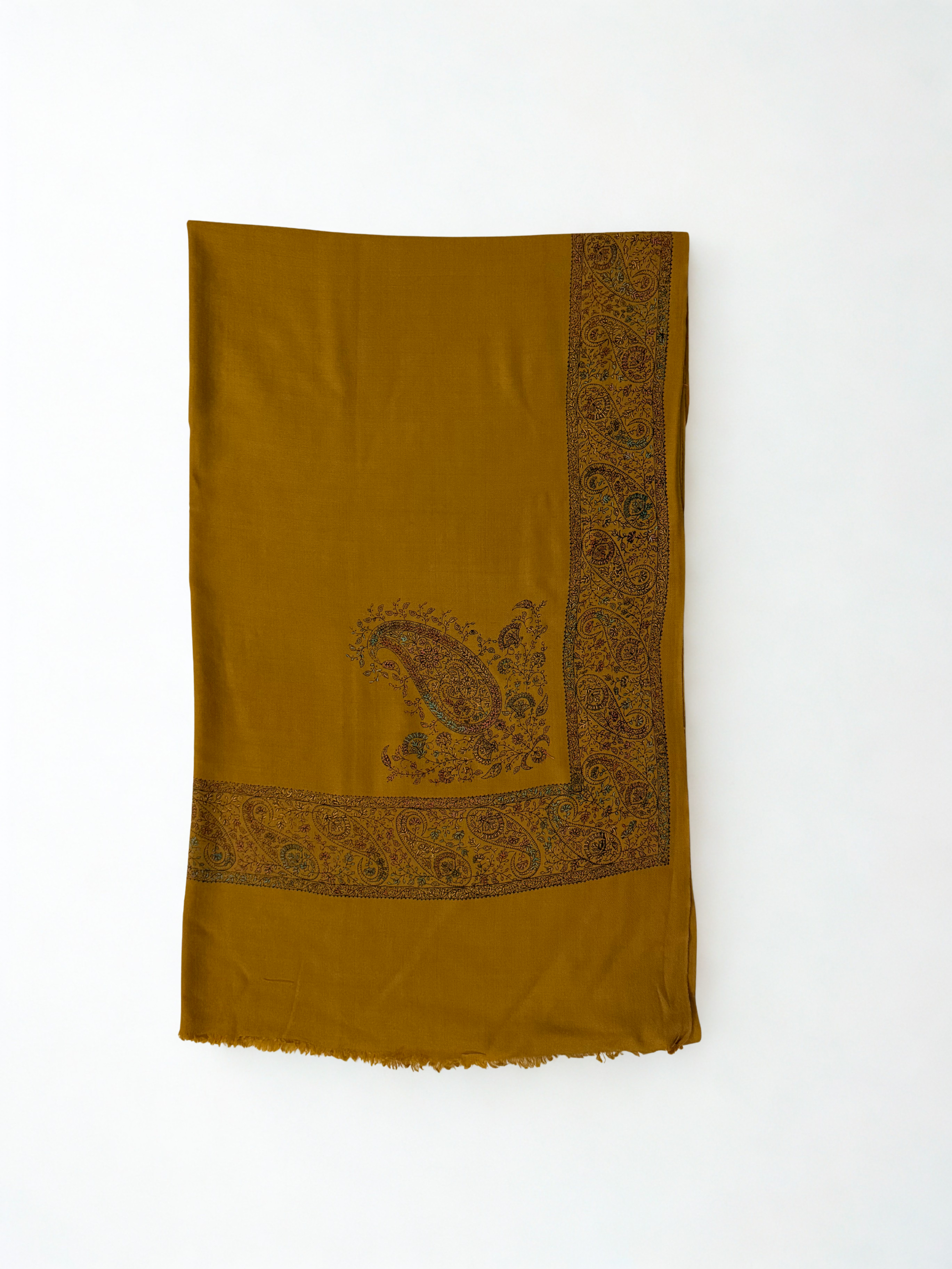 Crafted in Salampur, the Swati Shahtoosh Embroidered in mustard is a masterpiece of lightweight luxury. This handwoven shawl combines warmth with comfort, making it ideal for cooler seasons without compromising style. Its intricate embroidery enhances its rich texture, offering a sophisticated accessory that elevates any wardrobe with timeless elegance.