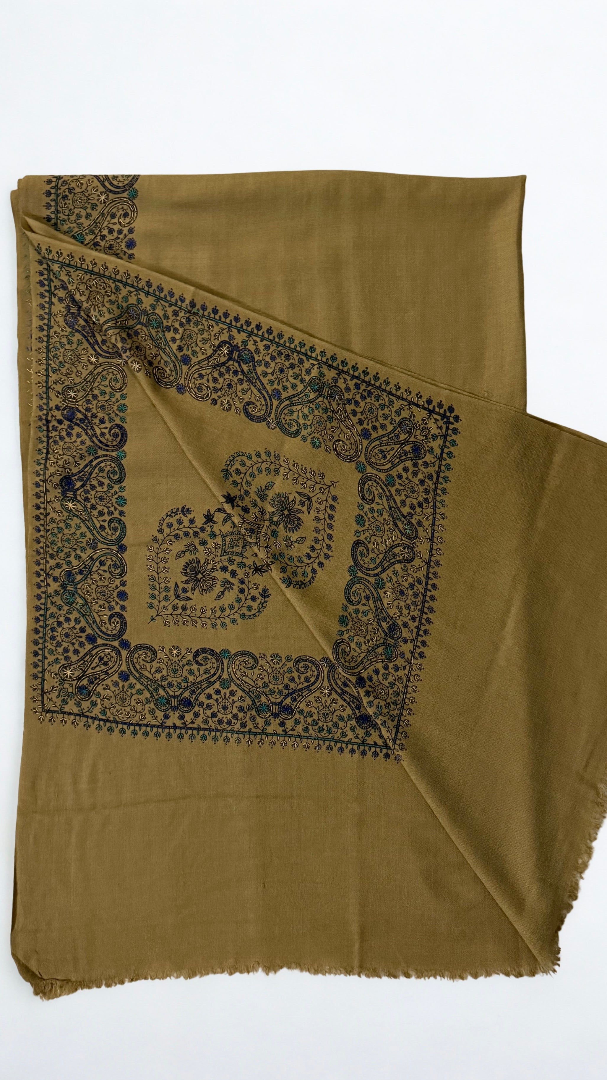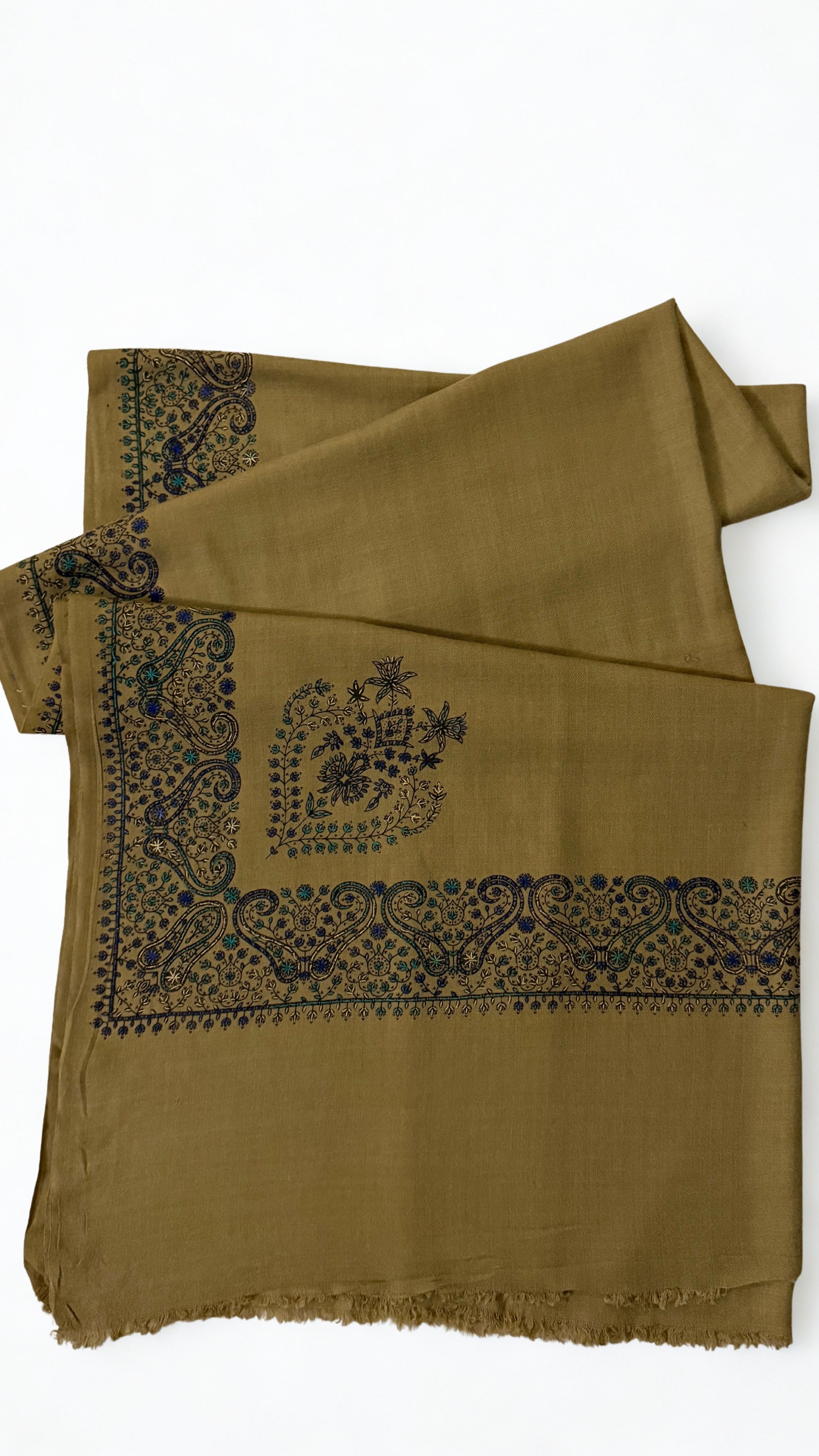 Experience the blend of luxury and tradition with the Swati Shahtoosh Embroidered shawl in khaki brown. Handwoven in Salampur Swat, this shawl offers exceptional warmth and comfort while showcasing intricate embroidery that reflects expert craftsmanship. Its natural tones and fine texture make it a refined accessory for sophisticated style and lasting elegance.